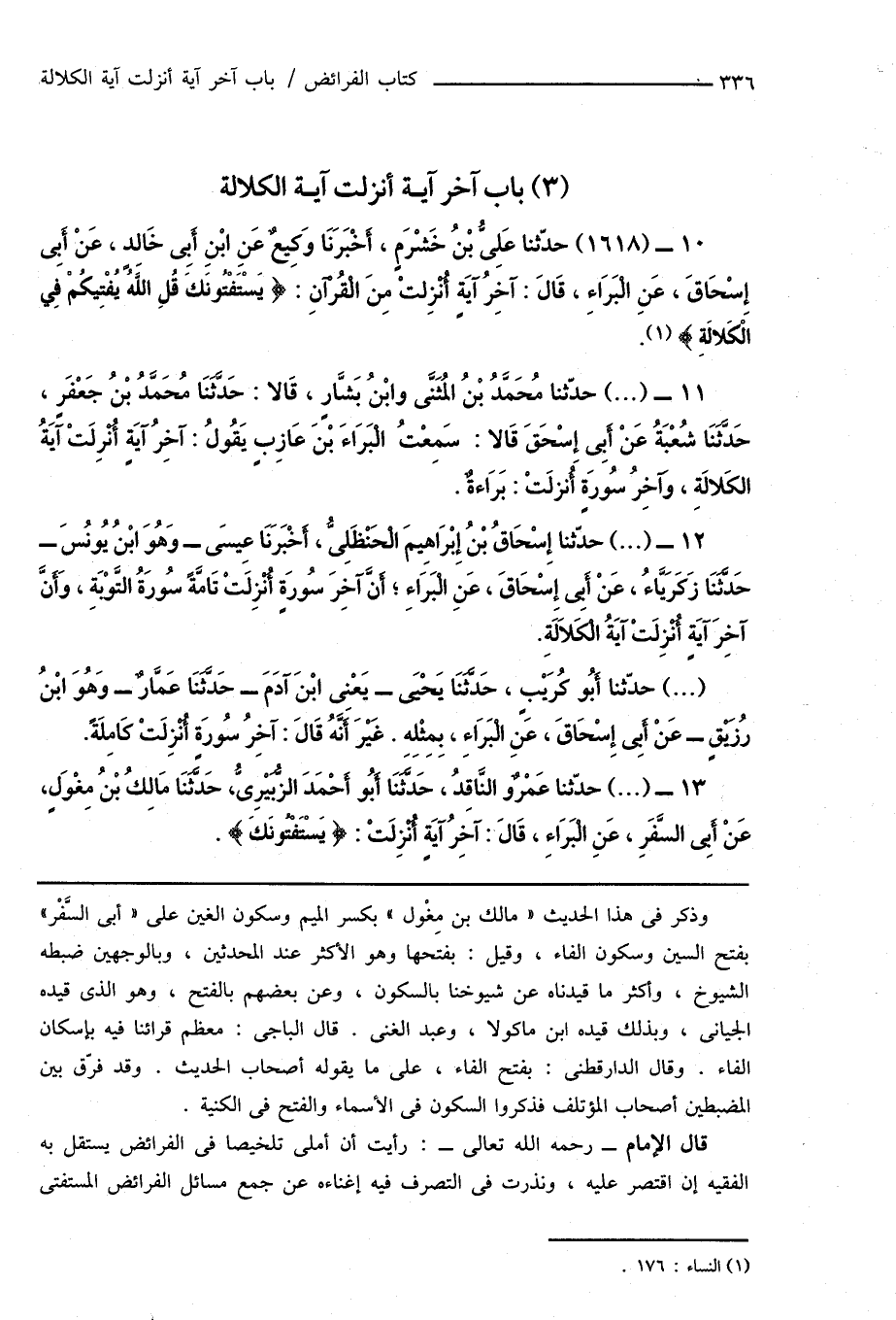 13 - (...) حدّثنا عَمْرٌو النَّاقِدُ، حَدَّثَنَا أَبُو أَحْمَدَ الزُّبَيْرِىُّ، حَدَّثَنَا مَالِكٌ بْنُ مِغْوَلٍ، عَنْ أَبِى السَّفَرِ، عَنِ الْبَرَاءِ، قَالَ: آخِرُ آيَةٍ أُنْزِلَتْ: {يَسْتَفْتُونَكَ}.