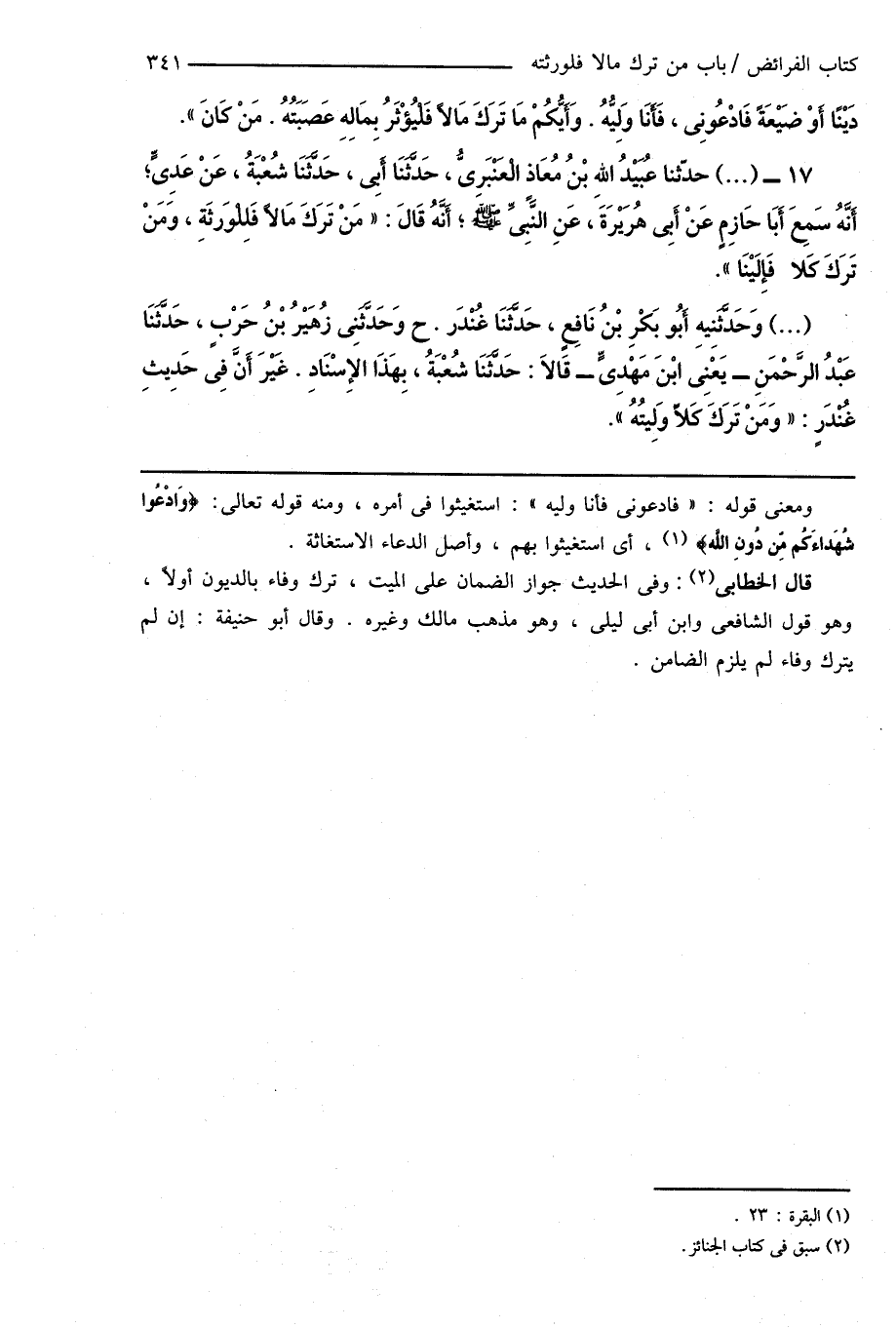 17 - (...) حدّثنا عُبَيْدُ اللهِ بْنُ مُعَاذٍ الْعَنْبَرِىُّ، حَدَّثَنَا أَبِى، حَدَّثَنَا شُعْبَةُ، عَنْ عَدِىٍّ؛ أَنَّهُ سَمِعَ أَبَا حَازِمٍ عَنْ أَبِى هُرَيْرَةَ، عَنِ النَّبِىِّ صَلَّى اللهُ عَلَيْهِ وَسَلَّمَ؛ أَنَّهُ قَالَ: " مَنْ تَرَكَ مَالاً فَلِلْوَرَثَةِ، وَمَنْ تَرَكَ كَلًّا فَإِلَيْنَا ".
