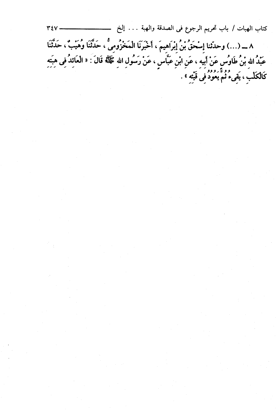 8 - (...) وحدّثنا إِسْحَاقُ بْنُ إِبْرَاهِيمَ، أَخْبَرَنَا الْمَخْزُومِىُّ، حَدَّثَنَا وُهَيْبٌ، حَدَّثَنَا عَبْدُ اللهِ بْنُ طَاوُسٍ عَنْ أَبِيهِ، عَنِ ابْنِ عَبَّاسٍ، عَنْ رَسُولِ اللهِ صَلَّى اللهُ عَلَيْهِ وَسَلَّمَ قَالَ: " الْعَائِدُ فِى هِبَتِهِ كَالْكَلْبِ، يَقِىءُ ثُمَّ يَعُودُ فِى قَيْئِهِ ".