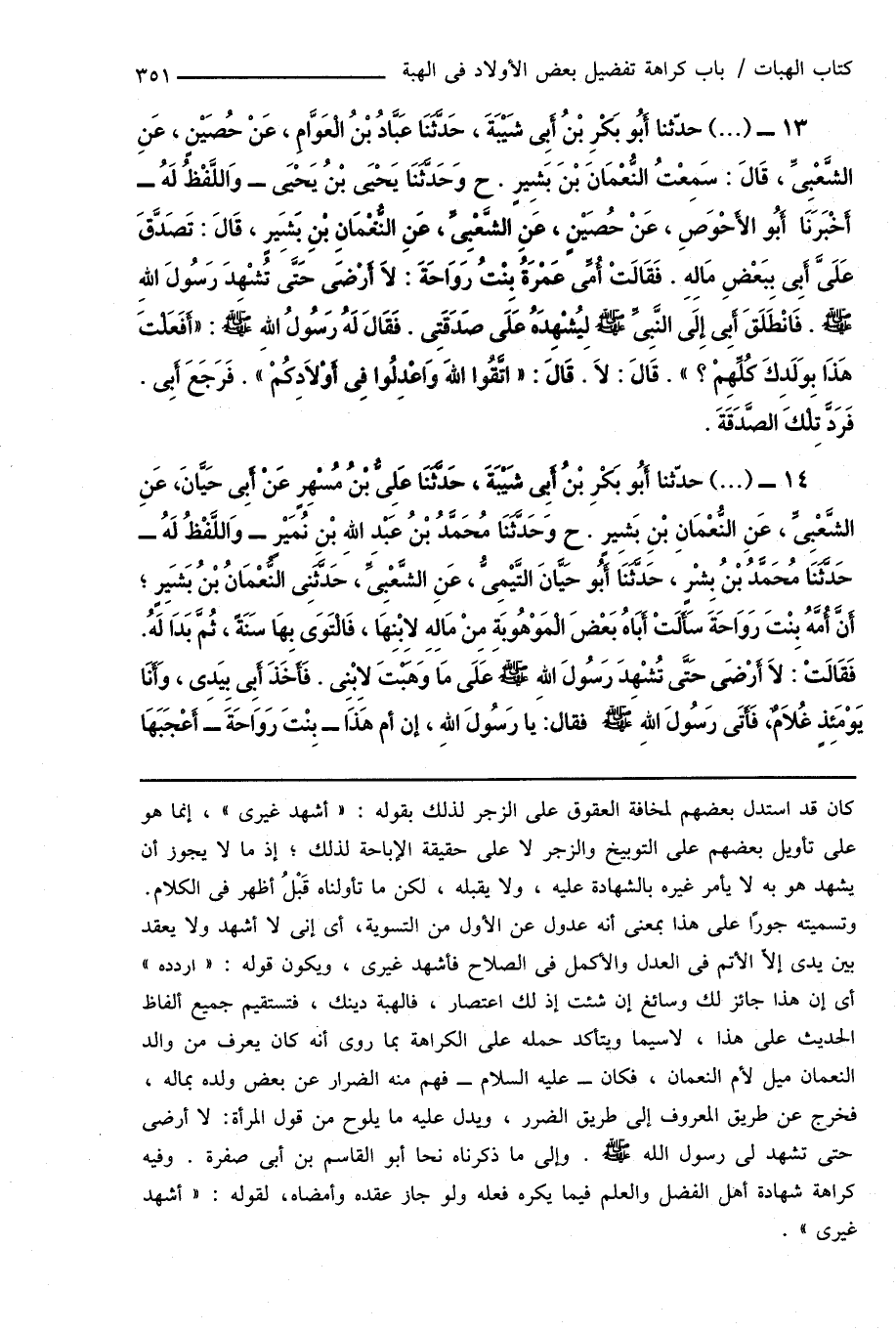 14 - (...) حدّثنا أَبُو بَكْرِ بْنُ أَبِى شَيْبَةَ، حَدَّثَنَا عَلِىُّ بْنُ مُسْهِرٍ عَنْ أَبِى حَيَّانَ، عَنِ الشَّعْبِىِّ، عَنِ النُّعْمَانِ بْنِ بَشِيرٍ. ح وَحَدَّثَنَا مُحَمَّدُ بْنُ عَبْدِ اللهِ بْنِ نُمَيْرٍ - وَاللَّفْظُ لَهُ - حَدَّثَنَا مُحَمَّدُ بْنُ بِشْرٍ، حَدَّثَنَا أَبُو حَيَّانَ التَّيْمِىُّ، عَنِ الشَّعْبِىِّ، حَدَّثَنِى النُّعْمَانُ بْنُ بَشَيرٍ؛ أَنَّ أُمَّهُ بِنْتَ رَوَاحَةَ سَأَلَتْ أَبَاهُ بَعْضَ الْمَوْهُوبَةِ مِنْ مَالِهِ لابْنِهَا، فَالْتَوَى بِهَا سَنَةً، ثُمَّ بَدَا لَهُ. فَقَالَتْ: لَا أَرْضَى حَتَّى تُشْهِدَ رَسُولَ الله صَلَّى اللهُ عَلَيْهِ وَسَلَّمَ عَلَى مَا وَهَبْتَ لاِبْنِى. فَأَخَذَ أَبِى بِيَدِى، وَأَنَا يَوْمَئِذٍ غُلَامٌ، فَأَتَى رَسُولَ اللهِ صَلَّى اللهُ عَلَيْهِ وَسَلَّمَ فَقَالَ: يا رَسُولَ اللهِ، إِنَّ أُمَّ هَذَا - بِنْتَ رَوَاحَةَ - أَعْجَبَهَا