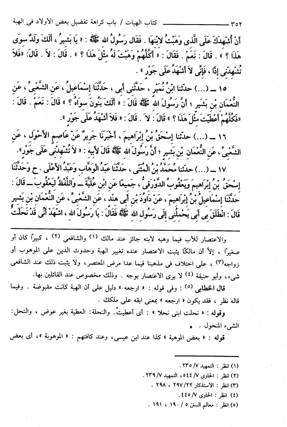 15 - (...) حدّثنا ابْنُ نُمَيْرٍ، حَدَّثَنِى أَبِى، حَدَّثَنَا إِسْمَاعِيلُ، عَنِ الشَّعْبِىِّ، عَنِ النُّعْمَانِ بْنِ بَشَيرٍ؛ أَنَّ رَسُولَ اللهِ صَلَّى اللهُ عَلَيْهِ وَسَلَّمَ قَالَ: " أَلَكَ بَنُونٌ سِوَاهُ؟ " قَالَ: نَعَمْ. قَالَ: " فَكُلَّهُمْ أَعْطَيْتَ مِثْلَ هَذَا؟ " قَالَ: لَا. قَالَ: " فَلَا أَشْهَدُ عَلَى جَوْرٍ ".