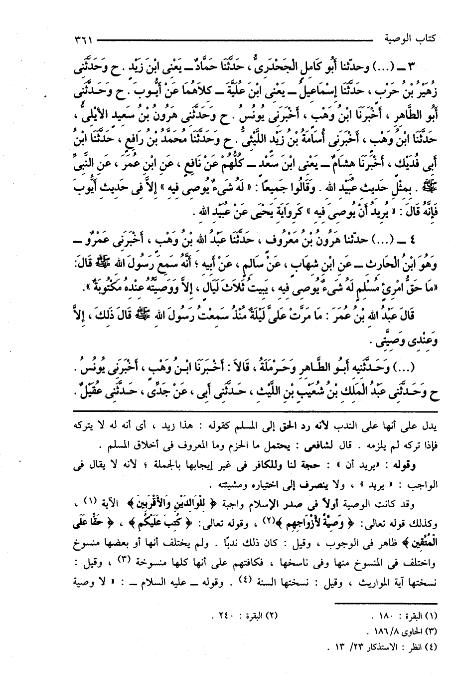3 - (...) وحدّثنا أَبُو كَامِلٍ الْجَحْدَرِىُّ، حَدَّثَنَا حَمَّادٌ - يَعْنِى ابْنَ زَيْدٍ. ح وَحَدَّثَنِى زُهَيْرُ بْنُ حَرْبٍ، حَدَّثَنَا إِسْمَاعِيلُ - يَعْنِى ابْنَ عُلَيَّةَ - كِلَاهُمَا عَنْ أَيُّوبَ. ح وَحَدَّثَنِى أَبُو الطَّاهِرِ، أَخْبَرَنَا ابْنُ وَهْبٍ، أَخْبَرَنِى يُونُسُ. ح وَحَدَّثَنِى هَارُونُ بْنُ سَعِيدٍ الأَيْلِىُّ، حَدَّثَنَا ابْنُ وَهْبٍ، أَخْبَرَنِى أُسَامَةُ بْنُ زَيْدٍ اللَّيْثِىُّ. ح وَحَدَّثَنَا مُحَمَّدُ بْنُ رَافِعٍ، حَدَّثَنَا ابْنُ أَبِى فُدَيْكٍ، أَخْبَرَنَا هِشَامٌ - يَعْنِى ابْنَ سَعْدٍ - كُلُّهُمْ عَنْ نَافِعٍ، عَنِ ابْنِ عُمَرَ، عَنِ النَّبِىِّ صَلَّى اللهُ عَلَيْهِ وَسَلَّمَ. بِمِثْلِ حَدِيثِ عُبَيْدِ اللهِ. وَقَالُوا جَمِيعًا: " لَهُ شَىءٌ يُوصِى فِيهِ " إِلَّا فِى حَدِيثِ أَيُّوبَ فَإِنَّهُ قَالَ: " يُرِيدُ أَنْ يُوصِىَ فِيهِ " كَرِوَايَةِ يَحْيَى عَنْ عُبَيْدِ اللهِ.