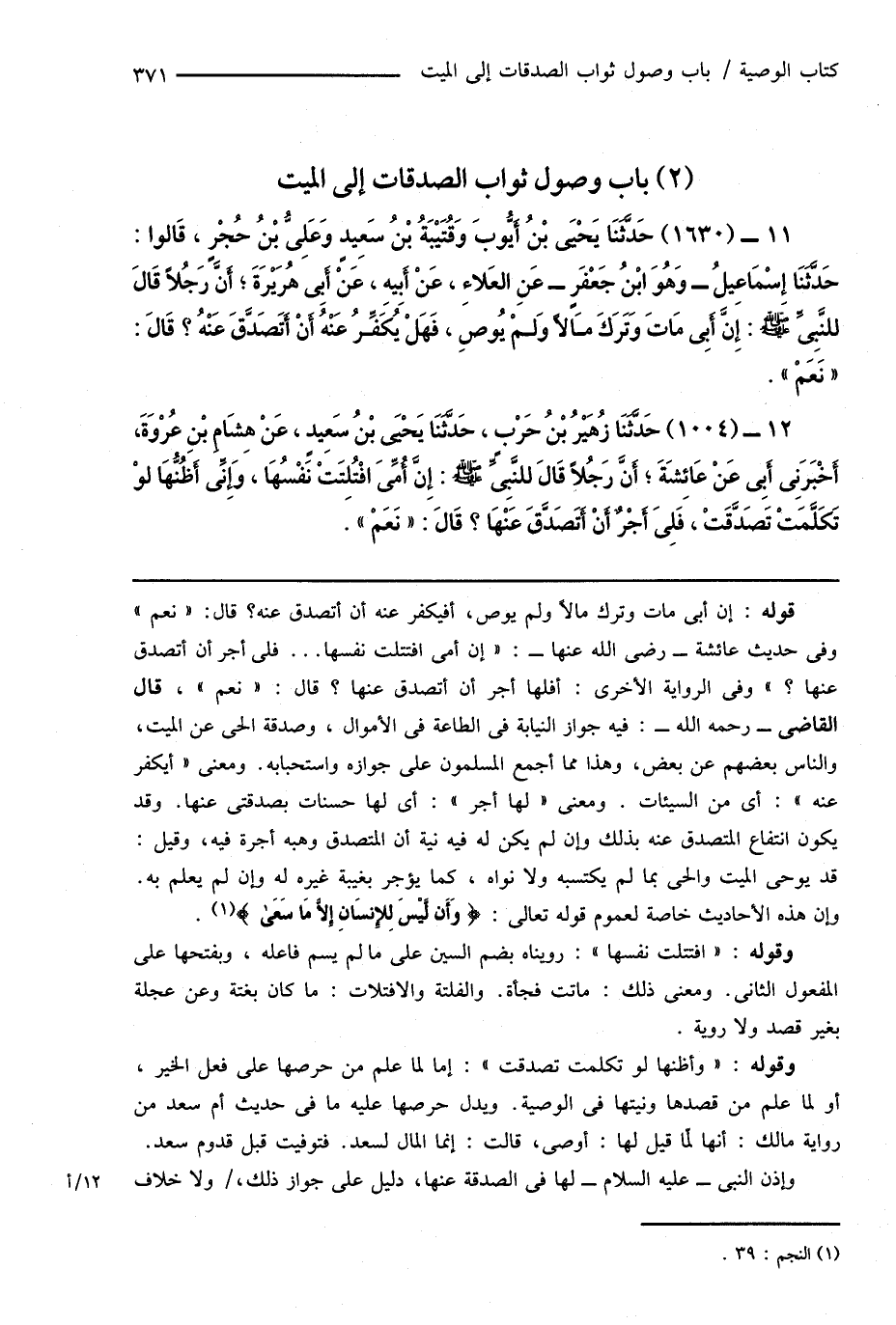 قوله: إن أبى مات وترك مالاً ولم يوص، أفيكفر عنه أن أتصدق عنه؟ قال: " نعم " وفى حديث عائشة - رضى الله عنها -: " إن أمى افتتلت نفسها ... فلى أجر أن أتصدق عنها؟ " وفى الرواية الأخرى: أفلها أجر أن أتصدق عنها؟ قال: " نعم "، قال القاضى - رحمه الله -: فيه جواز النيابة فى الطاعة فى الأموال، وصدقة الحى عن الميت، والناس بعضهم عن بعض، وهذا مما أجمع المسلمون على جوازه واستحبابه. ومعنى " أيكفر عنه ": أى من السيئات. ومعنى " لها أجر ": أى لها حسنات بصدقتى عنها. وقد يكون انتفاع المتصدق عنه بذلك وإن لم يكن له فيه نية أن المتصدق وهبه أجرة فيه، وقيل: قد يوحى الميت والحى بما لم يكتسبه ولا نواه، كما يؤجر بغيبة غيره له وإن لم يعلم به. وإن هذه الأحاديث خاصة لعموم قوله تعالى: {وَأَن لَّيْسَ لِلإِنسَانِ إِلَّا مَا سَعَى} (¬1).