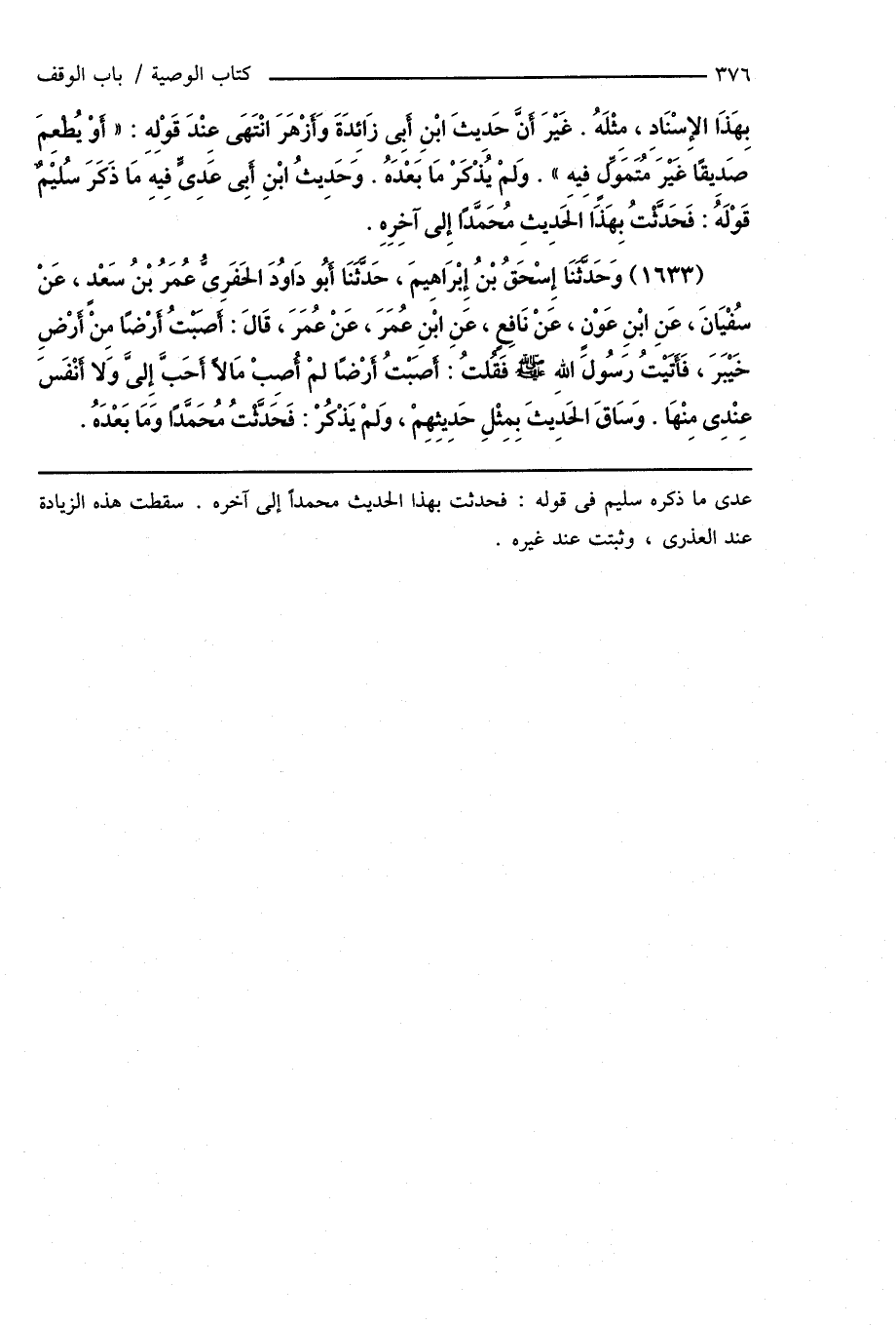 (1633) وَحَدَّثَنَا إِسْحَاقُ بْنُ إِبْرَاهِيمَ، حَدَّثَنَا أَبُو دَاوُدَ الحَفَرِىُّ عُمَرُ بْنُ سَعْدٍ، عَنْ سُفْيَانَ، عَنِ ابْنِ عَوْنٍ، عَنْ نَافِعٍ، عَنِ ابْنِ عُمَرَ، عَنْ عُمَرَ، قَالَ: أَصَبْتُ أَرْضًا مِنْ أَرْضِ خَيْبَرَ، فَأَتَيْتُ رَسُولَ اللهِ صَلَّى اللهُ عَلَيْهِ وَسَلَّمَ فَقُلْتُ: أَصَبْتُ أَرْضًا لَمْ أُصِبْ مَالاً أَحَبَّ إِلىَّ وَلا أَنْفَسَ عِنْدِى مِنْهَا. وَسَاقَ الحَدِيثَ بِمِثْلِ حَدِيثِهِمْ، وَلَمْ يَذْكُرْ: فَحَدَّثْتُ مُحَمَّدًا وَمَا بَعْدَهُ.