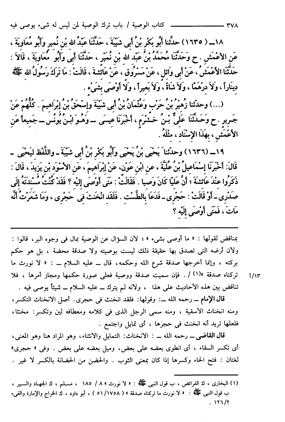 18 - (1635) حدّثنا أَبُو بَكْرِ بْنُ أَبِى شَيْبَةَ، حَدَّثَنَا عَبْدُ اللهِ بْنِ نُمَيْرٍ وَأَبُو مُعَاوِيَةَ، عَنِ الأَعْمَشِ. ح وَحَدَّثَنَا مُحَمَّدُ بْنُ عَبْدِ اللهِ بْنِ نُمَيْرٍ، حَدَّثَنَا أَبِى وَأَبُو معَاوِيَةَ، قَالَا: حَدَّثَنَا الأَعْمَشُ، عَنْ أَبِى وَائِلٍ، عَنْ مَسْرُوقٍ، عَنْ عَائِشَةَ، قَالَتْ: مَا تَرَكَ رَسُولُ اللهِ صَلَّى اللهُ عَلَيْهِ وَسَلَّمَ دِينَارًا، وَلَا دِرْهَمًا، وَلَا شَاةً، وَلَا بَعِيراً، وَلا أَوْصَى بِشَىْءٍ.