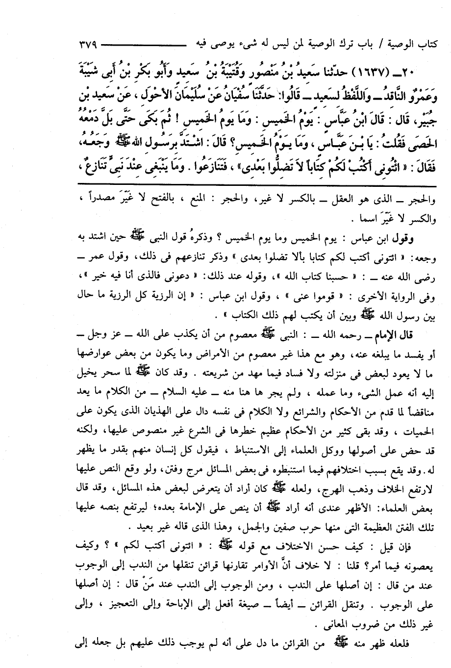 20 - (1637) حدّثنا سَعِيدُ بْنُ مَنْصُورٍ وَقُتَيْبَةُ بْنُ سَعِيدٍ وَأَبُو بَكْرِ بْنُ أَبِى شَيْبَةَ وَعَمْرٌو النَّاقِدُ - وَاللَّفْظُ لِسَعِيدٍ - قَالُوا: حَدَّثَنَا سُفْيَانُ عَنْ سُلَيْمَانَ الأَحْوَلِ، عَنْ سَعِيدِ بْنِ جُبَيْرٍ، قَال: قَالَ ابْنُ عَبَّاسٍ: يَوْمُ الخَمِيسِ: وَمَا يَومُ الخَمِيسِ! ثُمَّ بَكَى حَتَّى بَلَّ دَمْعُهُ الحَصَى فَقُلْتُ: يَا بْنَ عَبَّاسٍ، وَمَا يَوْمُ الخَمِيسِ؟ قَالَ: اشْتَدَّ بِرَسُولِ اللهِ صَلَّى اللهُ عَلَيْهِ وَسَلَّمَ وَجَعُهُ، فَقَالَ: " ائْتُونِى أَكْتُبْ لَكُمْ كِتَابًا لَا تَضِلُّوا بَعْدِى "، فَتَنَازَعُوا. وَمَا يَنْبَغِى عِنْدَ نَبِىٍّ تَنَازُعٌ،