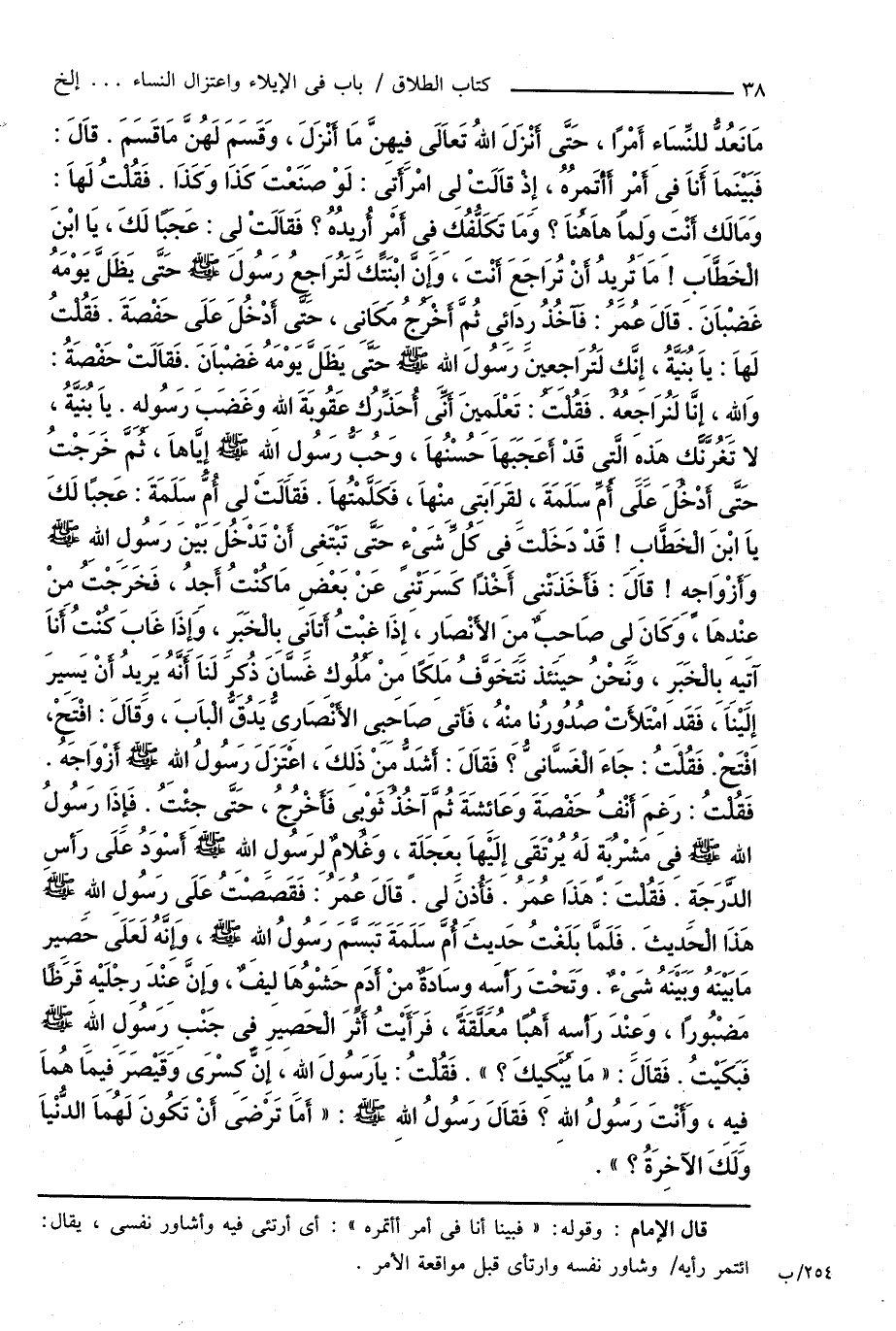 مَا نَعُدُّ لِلنِّسَاءِ أَمْرًا، حَتَّى أَنْزَلَ اللهُ تَعَالَى فِيهِنَّ مَا أَنْزَلَ، وَقَسَمَ لَهُنَّ مَا قَسَمَ. قَالَ: فَبَيْنَمَا أَنَا فِى أَمْرٍ أَأْتَمِرُهُ، إِذْ قَالَتْ لِى امْرَأَتِى: لَوْ صَنَعْتَ كَذَا وَكَذَا. فَقُلْتُ لَهَا: وَمَالَكِ أَنْتِ وَلِمَا هَاهُنَا؟ وَمَا تَكَلُّفُكِ فِى أَمْرِ أُرِيدُهُ؟ فَقَالَتْ لِى: عَجَبًا لَكَ، يَا ابْنَ الْخَطَّابِ! مَا تُرِيدُ أَنْ تُرَاجَعَ أَنْتَ، وَإِنَّ ابْنَتَكَ لَتُرَاجِعُ رَسُولَ اللهِ صَلَّى اللهُ عَلَيْهِ وَسَلَّمَ حَتَّى يَظَلَّ يَوْمَهُ غَضْبَانَ. قَالَ عُمَرُ: فَآخُذُ رِدَائِى ثُمَّ أَخْرُجُ مَكَانِى، حَتَّى أَدْخُلَ عَلَى حَفْصَةَ. فَقُلْتُ لَهَا: يَا بُنَيَّةُ، إِنَّك لَتُرَاجِعِينَ رَسُولَ اللهِ صَلَّى اللهُ عَلَيْهِ وَسَلَّمَ حَتَّى يَظَلَّ يَوْمَهُ غَضْبَانَ. فَقَالَتْ حَفْصَةُ: وَاللهِ، إِنَّا لَنُرَاجِعُهُ. فَقُلْتُ: تَعْلَمِينَ أَنِّى أُحَذِّرُكِ عَقُوبَةَ اللهِ وَغَضَبَ رَسُولِهِ. يَا بُنَيَّةُ، لا تَغُرَّنَّكِ هَذِهِ الَّتِى قَدْ أَعَجَبَهَا حُسْنُهَا، وَحُبُّ رَسُولِ اللهِ صَلَّى اللهُ عَلَيْهِ وَسَلَّمَ إِيَّاهَا، ثُمَّ خَرَجْتُ حَتَّى أَدْخُلَ عَلَى أُمِّ سَلَمَةَ، لِقَرَابَتِى مِنْهَا، فَكَلَّمْتُهَا. فَقَالَتْ لِى أُمُّ سَلَمَةَ: عَجبًا لَكَ يَا ابْنَ الْخَطَّابِ! قَدْ دَخَلْتَ فِى كُلِّ شَىْءٍ حَتَّى تَبْتَغِى أَنْ تَدْخُلَ بَيْنَ رَسُولِ اللهِ صَلَّى اللهُ عَلَيْهِ وَسَلَّمَ وَأَزْوَاجِهِ! قَالَ: فَأَخَذَتْنِى أَخْذًا كَسَرَتْنِى عَنْ بَعْضِ مَا كُنْتُ أَجِدُ، فَخَرَجْتُ منْ عِنْدِهَا، وَكَانَ لِى صَاحِبٌ مِنَ الأَنْصَارِ، إِذَا غِبْتُ أَتَانِى بِالْخَبَرِ، وَإِذَا غَابَ كُنْتُ أَنَا آتِيهِ بِالْخَبَرِ، وَنَحْنُ حِيْنَئِذٍ نَتَخَوَّفُ مَلِكًا مِنْ مُلُوكِ غَسَّانَ ذُكِرَ لَنَا أَنَّهُ يُرِيدُ أَنْ يَسِيرَ إِلَيْنَا، فَقَدِ امْتَلأَتْ صُدُورُنا مِنْهُ، فَأَتَى صَاحَبِى الأَنْصَارِىُّ يَدُقُّ الْبَابَ، وَقَالَ: افْتَحْ، افْتَحْ. فَقُلْتُ: جَاءَ الْغَسَّانِىُّ؟ فَقَالَ: أَشَدُّ مِنْ ذَلِكَ، اعْتَزَلَ رَسُولُ اللهِ صَلَّى اللهُ عَلَيْهِ وَسَلَّمَ أَزْوَاجَهُ. فَقُلْتُ: رَغِمَ أَنْفُ حَفْصَةَ وَعَائِشَةَ ثُمَّ آخُذُ ثَوْبِى فَأَخْرُجُ، حَتَّى جِئْتُ. فَإِذَا رَسُولُ اللهِ صَلَّى اللهُ عَلَيْهِ وَسَلَّمَ فِى مَشْرُبَةٍ لَهُ يُرْتَقَى إِلَيْهَا بِعَجَلَةٍ، وَغُلامٌ لِرَسُولِ اللهِ صَلَّى اللهُ عَلَيْهِ وَسَلَّمَ أَسْوَدُ عَلَى رَأسِ الدَّرَجَةِ. فَقُلْتَ: هَذَا عُمَرُ. فَأُذِنَ لِى. قَالَ عُمَرُ: فَقَصَصْتُ عَلَى رَسُولِ اللهِ صَلَّى اللهُ عَلَيْهِ وَسَلَّمَ هَذَا الْحَدِيثَ. فَلَمَّا بَلَغْتُ حَدِيث أُمَّ سَلَمَةَ تَبَسَّمَ رَسُولُ اللهِ صَلَّى اللهُ عَلَيْهِ وَسَلَّمَ، وَإِنَّهُ لَعَلَى حَصِير مَا بَيْنَهُ وَبَيْنَهُ شَىْءٌ. وَتَحْتَ رَأسِهِ وِسَادَةٌ مِنْ أَدَمٍ حَشْوُهَا لِيفٌ، وَإِنَّ عِنْدَ رِجْلَيْهِ قَرَظًا مَضْبُورًا، وَعِنْدَ رَأسِهِ أَهُبًا مُعَلَّقَةً، فَرَأَيْتُ أَثَرَ الْحَصِيرِ فِى جَنْبِ رَسُولِ اللهِ صَلَّى اللهُ عَلَيْهِ وَسَلَّمَ فَبَكَيْتُ. فَقَالَ: " مَا يُبْكِيكَ؟ ". فَقُلْتُ: يَا رَسُولَ اللهِ، إِنَّ كِسْرَى وَقَيْصَرَ فِيمَا هُمَا فِيهِ، وَأَنْتَ رَسُولُ اللهِ؟ فَقَالَ رَسُولُ اللهِ صَلَّى اللهُ عَلَيْهِ وَسَلَّمَ: " أَمَا تَرْضَىَ أَنْ تَكُونَ لَهُمَا الدُّنْيَا وَلَكَ الآخِرَةُ؟ ".