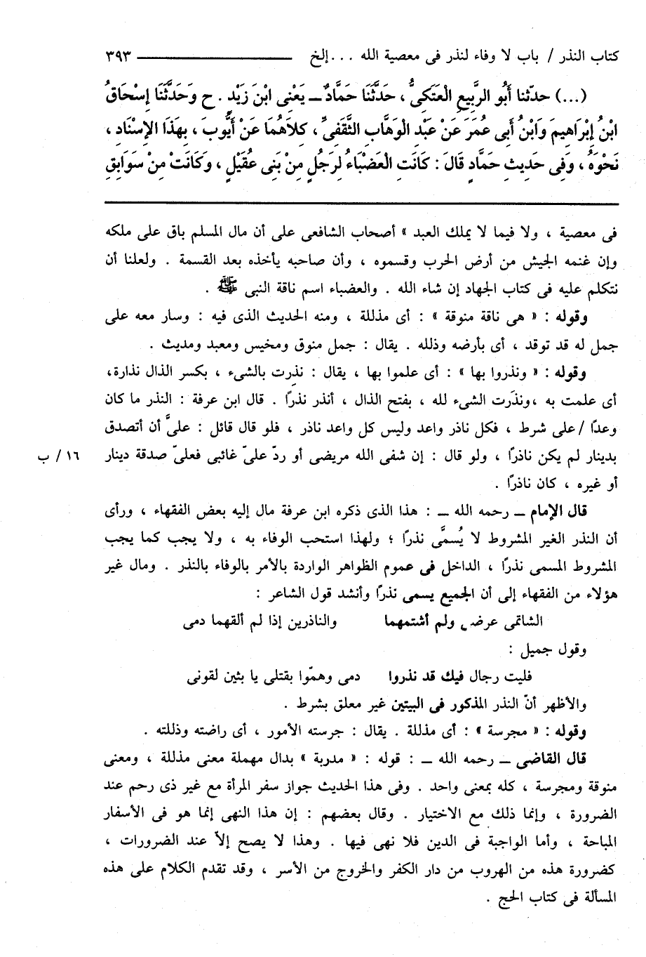 فى معصية، ولا فيما لا يملك العبد " أصحاب الشافعى على أن مال المسلم باق على ملكه وإن غنمه الجيش من أرض الحرب وقسموه، وأن صاحبه يأخذه بعد القسمة. ولعلنا أن نتكلم عليه فى كتاب الجهاد إن شاء الله. والعضباء اسم ناقة النبى صَلَّى اللهُ عَلَيْهِ وَسَلَّمَ.
