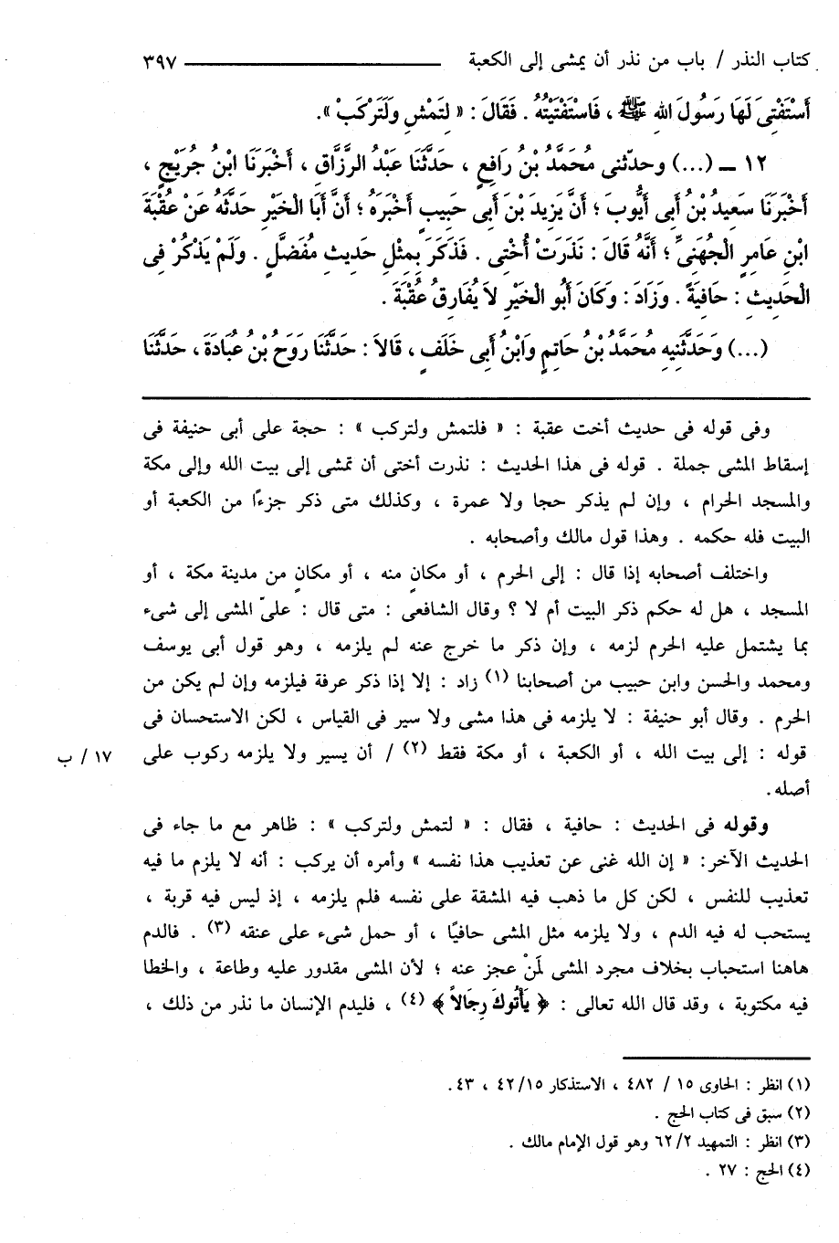 وقوله فى الحديث: حافية، فقال: " لتمش ولتركب ": ظاهر مع ما جاء فى الحديث الآخر: " إن الله غنى عن تعذيب هذا نفسه " وأمره أن يركب: أنه لا يلزم ما فيه تعذيب للنفس، لكن كل ما ذهب فيه المشقة على نفسه فلم يلزمه، إذ ليس فيه قربة، يستحب له فيه الدم، ولا يلزمه مثل المشى حافيًا، أو حمل شىء على عنقه (¬3). فالدم هاهنا استحباب بخلاف مجرد المشى لِمَنْ عجز عنه؛ لأن المشى مقدور عليه وطاعة، والخطا فيه مكتوبة، وقد قال الله تعالى: {يَأْتُوكَ رِجَالاً} (¬4)، فليدم الإنسان ما نذر من ذلك،