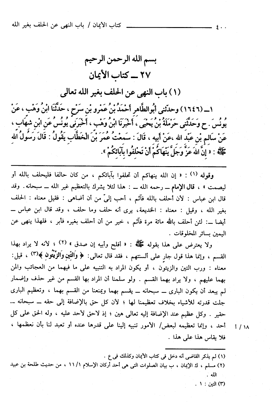 1 - (1646) وحدّثنى أَبُو الطَّاهِرِ أَحْمَدُ بْنُ عَمْرِو بْنِ سَرْحٍ، حَدَّثَنَا ابْنُ وَهْبٍ، عَنْ يُونُسَ. ح وَحَدَّثَنِى حَرْمَلَةُ بْنُ يَحْيَى، أَخْبَرَنَا ابْنُ وَهْبٍ، أَخْبَرَنِى يُونُسُ عَنِ ابْنِ شِهَابٍ، عَنْ سَالِمِ بْنِ عَبْدِ اللهِ، عَنْ أَبِيهِ، قَالَ: سَمِعْتُ عُمَرَ بْنَ الْخَطَّابِ يَقُولُ: قَالَ رَسُولُ اللهِ صَلَّى اللهُ عَلَيْهِ وَسَلَّمَ: " إِنَّ اللهَ عَزَّ وَجَلَّ يَنْهَاكُمْ أَنْ تَحْلِفُوا بِآبَائِكُمْ ".