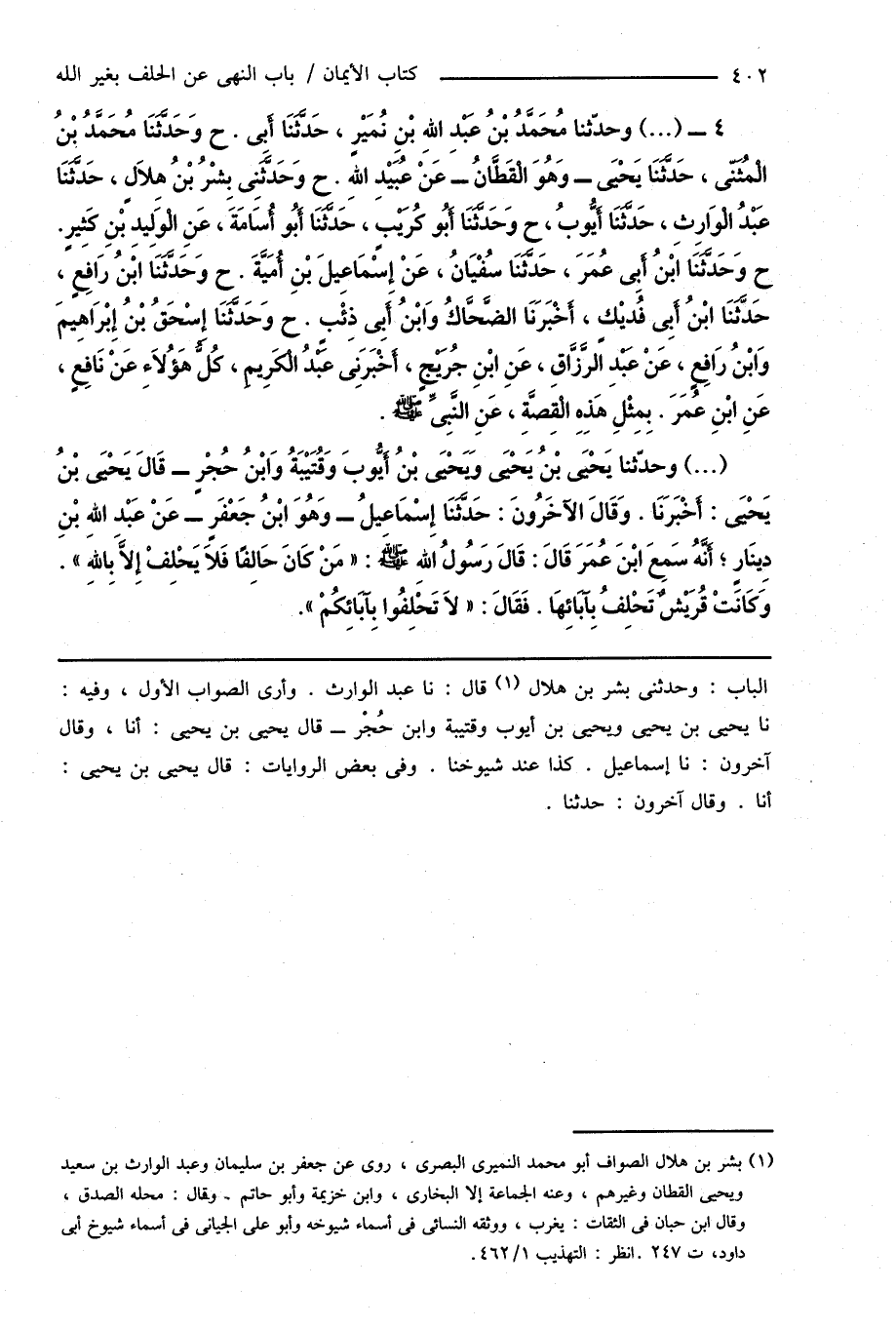 (...) وحدّثنا يَحْيَى بْنُ يَحْيَى وَيَحْيَى بْنُ أَيُّوبَ وَقُتَيْبَةُ وَابْنُ حُجْرٍ - قَالَ يَحْيَى بْنُ يَحْيَى: أَخْبَرَنَا. وَقَالَ الآخَرُونَ: حَدَّثَنَا إِسْمَاعِيلُ - وَهُوَ ابْنُ جَعْفَرٍ - عَنْ عَبْدِ اللهِ بْنِ دِينَارٍ؛ أَنَّهُ سَمِعَ ابْنَ عُمَرَ قَالَ: قَالَ رَسُولُ اللهِ صَلَّى اللهُ عَلَيْهِ وَسَلَّمَ: " مَنْ كَانَ حَالِفًا فَلَا يَحْلِفْ إِلَّا بِاللهِ ". وَكَانَتْ قُرَيْشٌ تَحْلِفُ بِآبَائِهَا. فَقَالَ: " لَا تَحلِفُوا بِآبَائِكُمْ ".