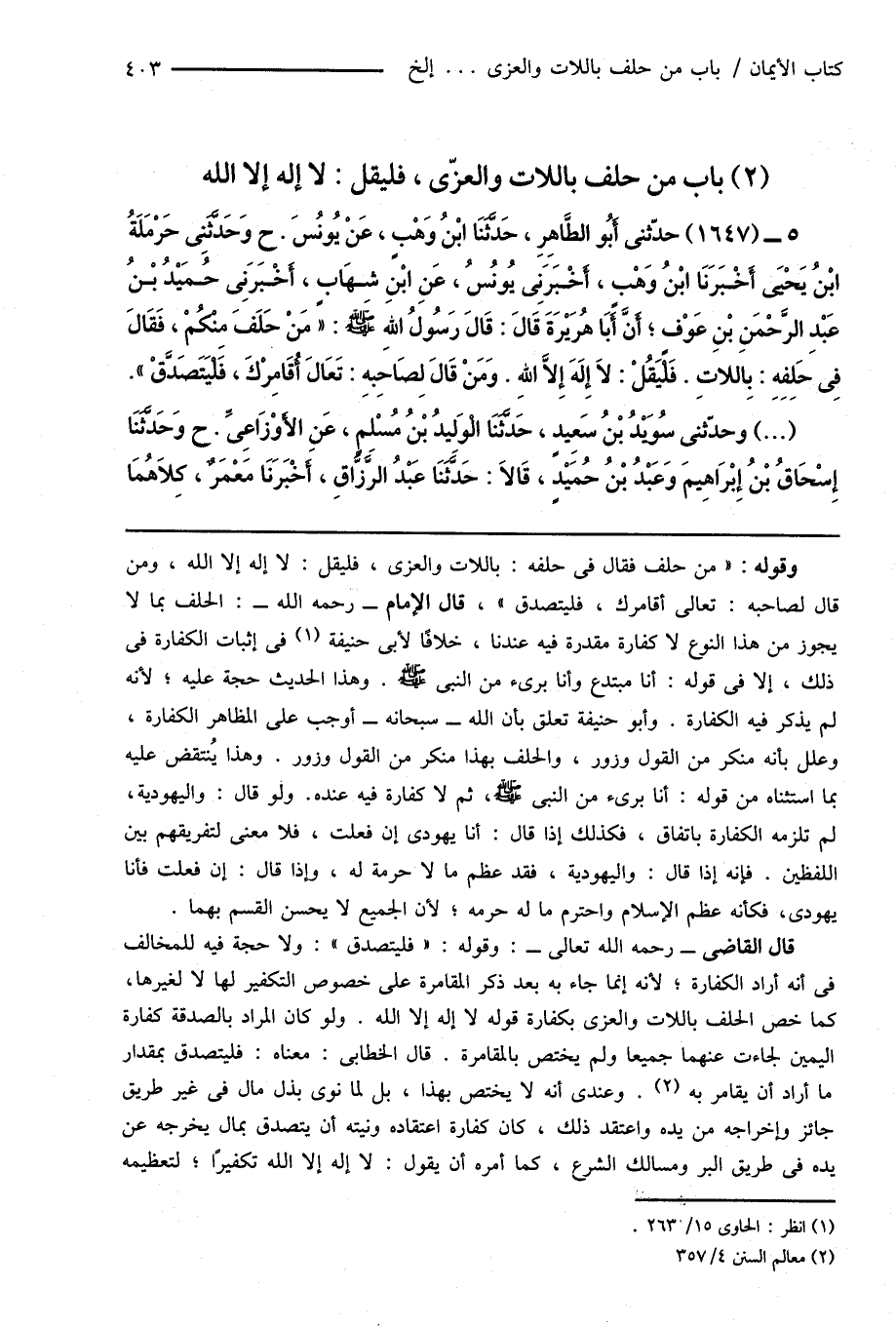 5 - (1647) حدّثنى أَبُو الطَّاهِرِ، حَدَّثَنَا ابْنُ وَهْبٍ، عَنْ يُونُسَ. ح وَحَدَّثَنِى حَرْمَلَةُ ابْنُ يَحْيَى أَخْبَرَنَا ابْنُ وَهْبٍ، أَخْبَرَنِى يُونُسُ، عَنِ ابْنٍ شِهَابٍ، أَخْبَرَنِى حُمَيْدُ بْنُ عَبْدِ الرَّحْمَنِ بْنِ عَوْفٍ؛ أَنَّ أَبَا هُرَيْرَةَ قَالَ: قَالَ رَسُولُ اللهِ صَلَّى اللهُ عَلَيْهِ وَسَلَّمَ: " مَنْ حَلَفَ مِنْكُمْ، فَقَالَ فِى حَلِفِهِ: بِاللاتِ. فَلْيَقُلْ: لَا إِلَهَ إِلَّا اللهِ. وَمَنْ قَالَ لِصَاحِبِهِ: تَعَالَ أُقَامِرْكَ، فَلْيَتَصَدَّقْ ".
