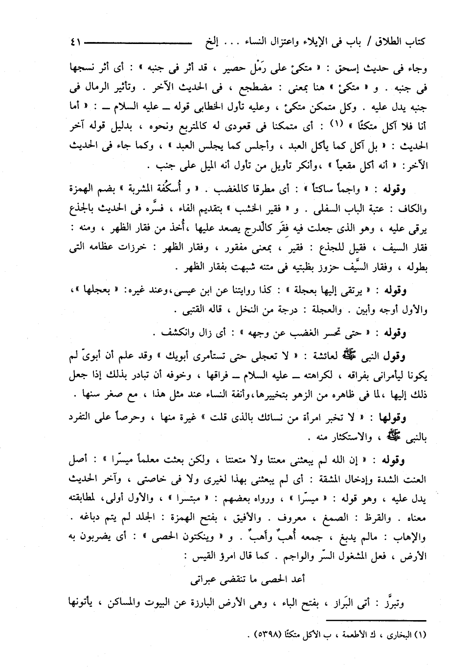 وقوله: " واجماً ساكتاً ": أى مطرقاً كالمغضب. " وأُسكُفة المشربة " بضم الهمزة والكاف: عتبة الباب السفلى. و " فقير الخشب " بتقديم الفاء، فسَّره فى الحديث بالجذع يرقى عليه، وهو الذى جعلت فيه فِقَر كالدرج يصعد عليها، أُخذ من فقار الظهر، ومنه: فقار السيف، فقيل للجذع: فقر، بمعنى مفقور، وفقار الظهر: خرزات عظامه التى بطوله، وفقار السَّيف حزوز بظبتيه فى متنه شبهت بفقار الظهر.