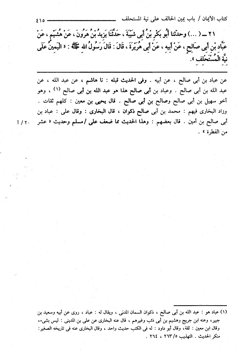 21 - (...) وحدّثنا أَبُو بَكْرِ بْنُ أَبِى شَيْبَةَ، حَدَّثَنَا يَزِيدُ بْنُ هَارُونَ، عَنْ هُشَيْمٍ، عَنْ عَبَّادِ بْنِ أَبِى صَالِحٍ، عَنْ أَبِيهِ، عَنْ أَبِى هُرَيْرَةَ، قَالَ: قَالَ رَسُولُ اللهِ صَلَّى اللهُ عَلَيْهِ وَسَلَّمَ: " الْيَمِينُ عَلَى نِيَّةِ الْمُسْتَحْلِفِ ".