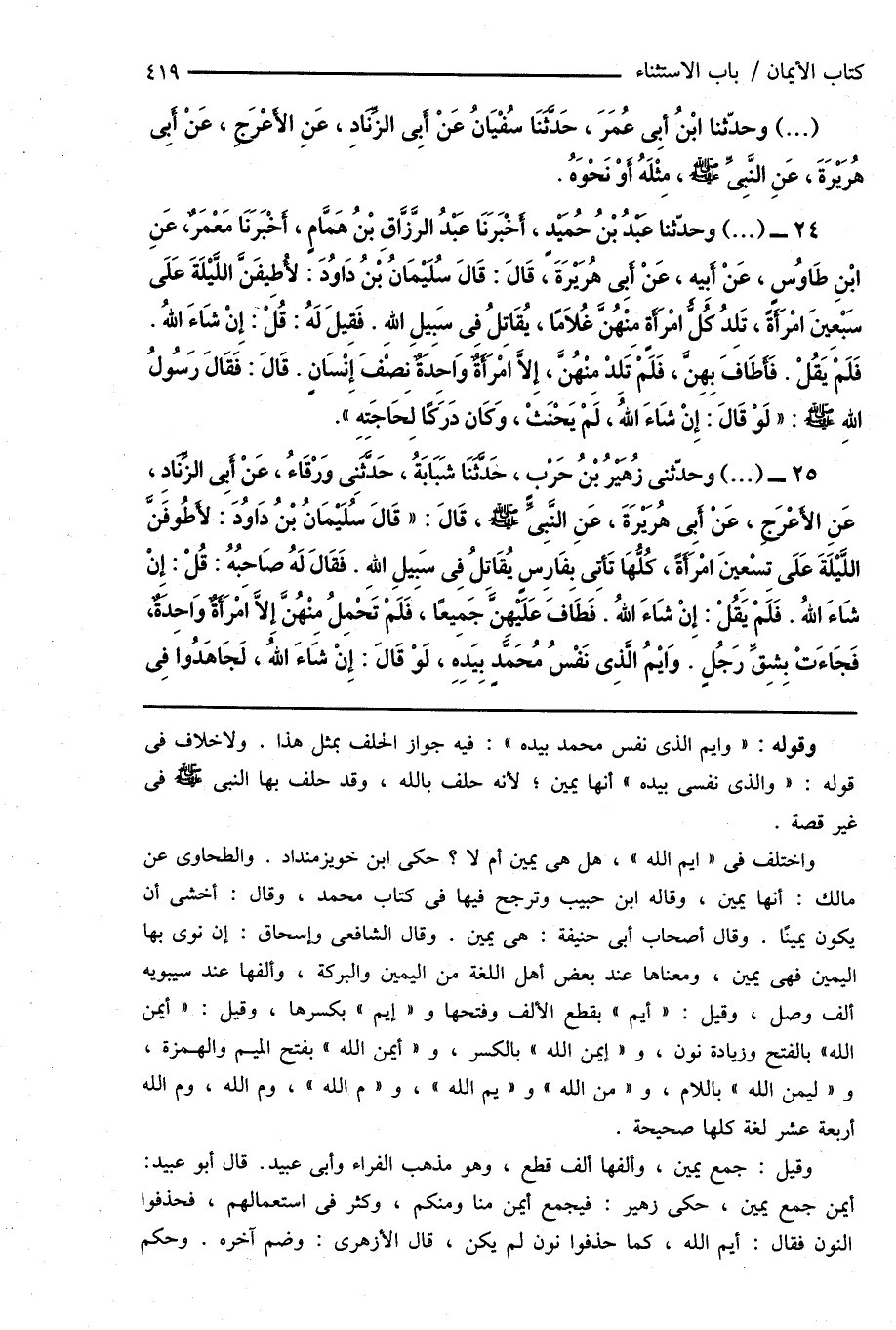 25 - (...) وحدّثنى زُهَيْرُ بْنُ حَرْبٍ، حَدَّثَنَا شَبَابَةُ، حَدَّثَنِى وَرْقَاءُ، عَنْ أَبِى الزِّنَادِ، عَنِ الأَعْرَجِ، عَنْ أَبِى هُرَيْرَةَ، عَنِ النَّبِىِّ صَلَّى اللهُ عَلَيْهِ وَسَلَّمَ، قَالَ: " قَالَ سُلَيْمَانُ بْنُ دَاوُدَ: لأَطُوفَنَّ اللَّيْلَةَ عَلَى تِسْعِينَ امْرَأَةً، كُلُّهَا تَأْتِى بِفَارِسٍ يُقَاتِلُ فِى سَبِيلِ اللهِ. فَقَالَ لَهُ صَاحِبُهُ: قُلْ: إِنْ شَاءَ اللهُ. فَلَمْ يَقُلْ: إِنْ شَاءَ اللهُ. فَطَاَفَ عَلَيْهِنَّ جَمِيعًا، فَلَمْ تَحْمِلُ مِنْهُنَّ إِلَّا امْرَأَةٌ وَاحِدَةٌ، فَجَاءَتْ بِشِقِّ رَجُلٍ. وَايْمُ الَّذِى نَفْسُ مُحَمَّدٍ بِيَدِهِ، لَوْ قَالَ: إِنْ شَاءَ اللهُ، لَجَاهَدُوا فِى