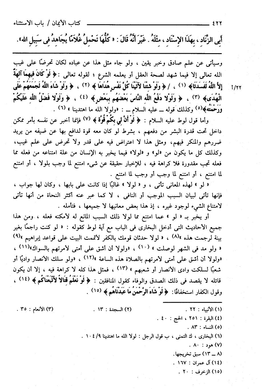 أو يخبر بـ " لو " عما امتنع مما لولا ذلك السبب المانع له لأمكنه فعله، ومن هذا جميع الأحاديث التى أدخل البخارى فى الباب مع آية لوط كقوله: " لو كنت راجمًا بغير بينة لرجمت هذه " (¬8)، " لولا حدثان قومك بالكفر لأتممت البيت على قواعد إبراهيم " (¬9) " ولو مد فى الشهر لوصلت " (¬10)، " ولولا أن أشق على أمتى لأمرتهم بالسواك " (¬11)، " ولولا أن أشق على أمتى لأمرتهم بالصلاة هذه الساعة " (¬12)، " ولو سلك الأنصار واديًا أو شعبًا لسلكت وادى الأنصار أو شعبهم " (¬13)، فمثل هذا كله لا كراهة فيه، إلا أن يكون قائله لا يقصد فى ذلك الصدق والوفاء كقول المنافقين: {لَوْ نَعْلَمُ قِتَالاً لأَتَّبَعْنَاكُم} (¬14)، وقول الكفار استخفافًا: {لَوْ شَاءَ الرَّحْمَنُ مَا عَبَدْنَاهُم} (¬15).