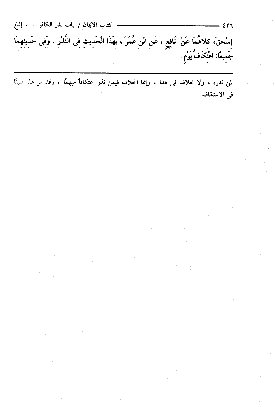 إِسْحَاقَ، كِلَاهُمَا عَنْ نَافِعٍ، عَنِ ابْنِ عُمَرَ، بِهَذَا الْحَدِيثِ فِى النَّذْرِ. وَفِى حَدِيثِهِمَا جَمِيعًا: اعْتَكَافُ يَوْمٍ.