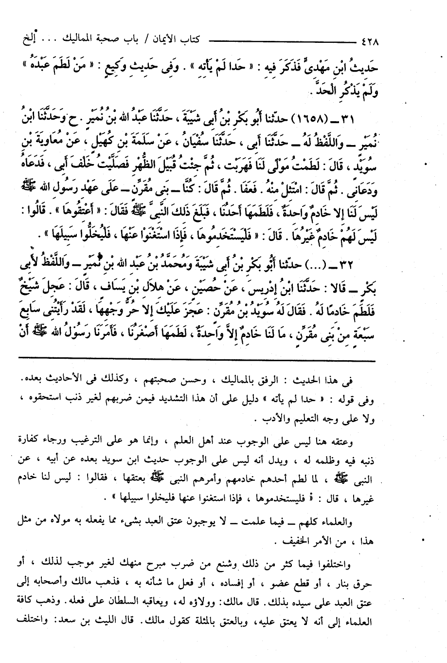 31 - (1658) حدّثنا أَبُو بَكْرِ بْنُ أَبِى شَيْبَةَ، حَدَّثَنَا عَبْدُ اللهِ بْنُ نُمَيْرٍ. ح وَحَدَّثَنَا ابْنُ نُمَيْرٍ - وَاللَّفْظُ لَهُ - حَدَّثَنَا أَبِى، حَدَّثَنَا سُفْيَانُ، عَنْ سَلَمَةَ بْنِ كُهَيْلٍ، عَنْ مُعَاوِيَةَ بْنِ سُوَيْدٍ، قَالَ: لَطَمْتُ مَوْلًى لَنَا فَهَرَبْتُ، ثُمَّ جِئْتُ قُبَيْلَ الظُّهْرِ فَصَلَّيْتُ خَلْفَ أَبِى، فَدَعَاهُ وَدَعَانِى. ثُمَّ قَالَ: امْتَثِلْ مِنْهُ. فَعَفَا. ثُمَّ قَالَ: كُنَّا - بَنِى مُقَرِّنٍ - عَلَى عَهْدِ رَسُولِ اللهِ صَلَّى اللهُ عَلَيْهِ وَسَلَّمَ لَيْسَ لَنَا إِلا خَادِمٌ وَاحِدَةٌ، فَلَطَمَهَا أَحَدُنَا، فَبَلَغَ ذَلِكَ النَّبِىَّ صَلَّى اللهُ عَلَيْهِ وَسَلَّمَ فَقَالَ: " أَعْتِقُوهَا ". قَالُوا: لَيْسَ لَهُمْ خَادِمٌ غَيْرُهَا. قَالَ: " فَلْيَسْتَخَدِمُوهَا، فَإِذَا اسْتَغْنَوْا عَنْهَا، فَلْيُخَلُّوا سَبِيلَهَا ".
