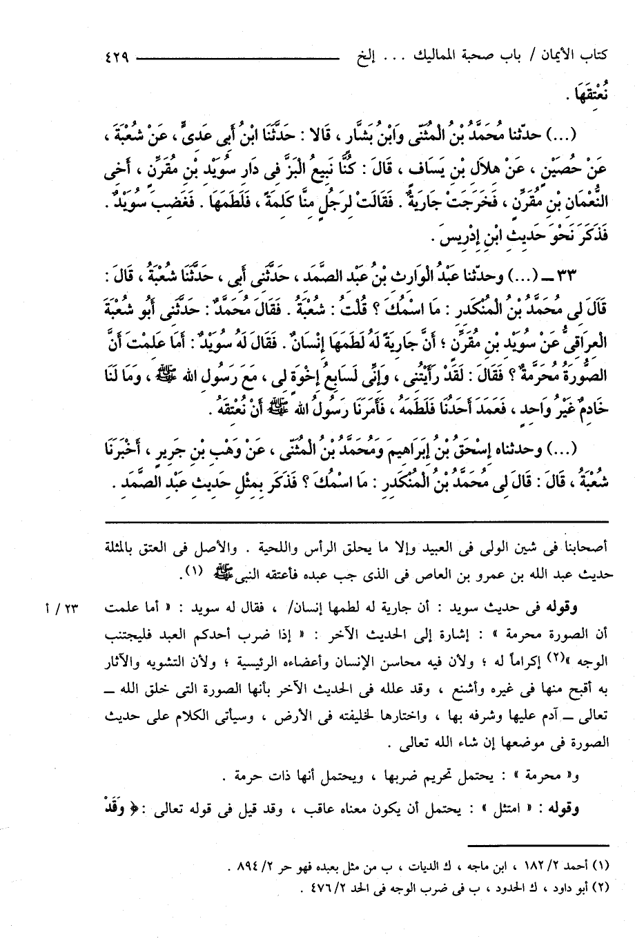 33 - (...) وحدّثنا عَبْدُ الْوَارِثِ بْنُ عَبْدِ الصَّمَدِ، حَدَّثَنِى أَبِى، حَدَّثَنَا شُعْبَةُ، قَالَ: قَالَ لِى مُحَمَّدُ بْنُ الْمُنْكَدِرِ: مَا اسْمُكَ؟ قُلْتُ: شُعْبَةُ. فَقَالَ مُحَمَّدٌ: حَدَّثَنِى أَبُو شُعْبَةَ الْعِرَاقِىُّ عَنْ سُوَيْدِ بْنِ مُقَرِّنٍ؛ أَنَّ جَارِيَةً لَهُ لَطَمَهَا إِنْسَانٌ. فَقَالَ لَهُ سُوَيْدٌ: أَمَا عَلِمْتَ أَنَّ الصُّورَةُ مُحَرَّمةٌ؟ فَقَالَ: لَقَدْ رَأَيْتُنِى، وَإِنِّى لَسَابِعُ إِخْوَةٍ لِى، مَعَ رَسُولِ اللهِ صَلَّى اللهُ عَلَيْهِ وَسَلَّمَ، وَمَا لَنَا خَادِمٌ غَيْرُ وَاحِدٍ، فَعَمَدَ أَحَدُنَا فَلَطَمَهُ، فَأَمَرَنَا رَسُولُ اللهِ صَلَّى اللهُ عَلَيْهِ وَسَلَّمَ أَنْ نُعْتِقَهُ.