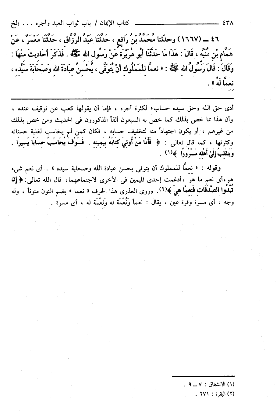 46 - (1667) وحدّثنا مُحَمَّدُ بْنُ رَافِعٍ، حَدَّثَنَا عَبْدُ الرَّزَّاقِ، حَدَّثَنَا مَعْمَرٌ، عَنْ هَمَّامِ بْنِ مُنَبِّهٍ، قَالَ: هَذَا مَا حَدَّثَنَا أَبُو هُرَيْرَة عَنْ رَسُولِ اللهِ صَلَّى اللهُ عَلَيْهِ وَسَلَّمَ. فَذَكَرَ أَحَادِيثَ مِنْهَا: وَقَالَ: قَالَ رَسُولُ اللهِ صَلَّى اللهُ عَلَيْهِ وَسَلَّمَ: " نعمَّا لِلْمَمْلُوكِ أَنْ يُتَوَفَّى، يُحْسِنُ عِبَادَةَ اللهِ وَصَحَابَةَ سَيِّدِهِ، نعمَّا لَهُ ".