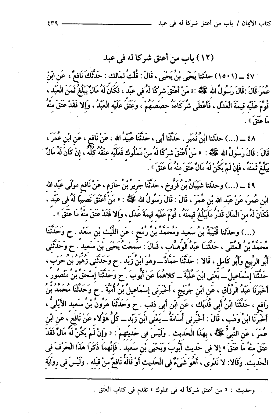 48 - (...) حدّثنا ابْنُ نُمَيْرٍ. حَدَّثَنَا أَبِى، حَدَّثَنَا عُبَيْدُ اللهِ، عَنْ نَافِعٍ، عَنِ ابْنِ عُمَرَ، قَالَ: قَالَ رَسُولُ اللهِ صَلَّى اللهُ عَلَيْهِ وَسَلَّمَ: " مَنْ أَعْتَقَ شِرْكًا لَهُ مِنْ مَمْلُوكٍ فَعَلَيْهِ عِتْقُهُ كُلُّهُ، إِنْ كَانَ لَهُ مَالٌ يَبْلُغُ ثَمَنَهُ، فَإِنْ لَمْ يَكُنْ لَهُ مَالٌ عَتَقَ مِنْهُ مَا عَتَقَ ".