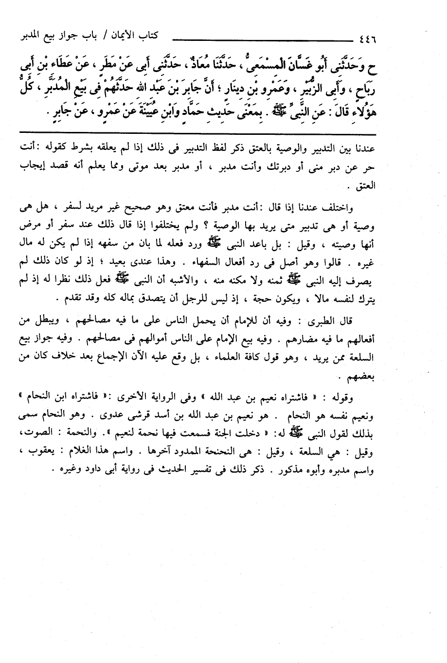 وقوله: " فاشتراه نعيم بن عبد الله " وفى الرواية الأخرى: " فاشتراه ابن النحام " ونعيم نفسه هو النحام. هو نعيم بن عبد الله بن أسد قرشى عدوى. وهو النحام سمى بذلك لقول النبى صَلَّى اللهُ عَلَيْهِ وَسَلَّمَ له: " دخلت الجنة فسمعت فيها نحمة لنعيم ". والنحمة: الصوت، وقيل: هي السلعة، وقيل: هى النحنحة الممدود آخرها. واسم هذا الغلام: يعقوب، واسم مدبره وأبوه مذكور. ذكر ذلك فى تفسير الحديث فى رواية أبى داود وغيره.