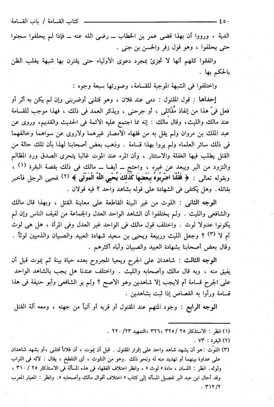 (¬3) اللوْث: هو أن يشهد شاهد واحد على إقرار المقتول. قبل أن يموت، أن فلاناً قتلنى، أو يشهد شاهدان على عداوة بينهما أو تهديد منه له ونحو ذلك. وهو من التلوث، أى التلطخ، يقال: لاثه فى التراب ولوثه. انظر: اللسان، مادة " لوث "، وانظر اختلاف الفقهاء فى هذه المسألة فى الاستذكار 25/ 310، وقد أحال ابن عبد البر تفصيل المسأله إلى كتاب " اختلاف أقوال مالك وأصحابه ". وانظر: المعيار المعرب 2/ 312.