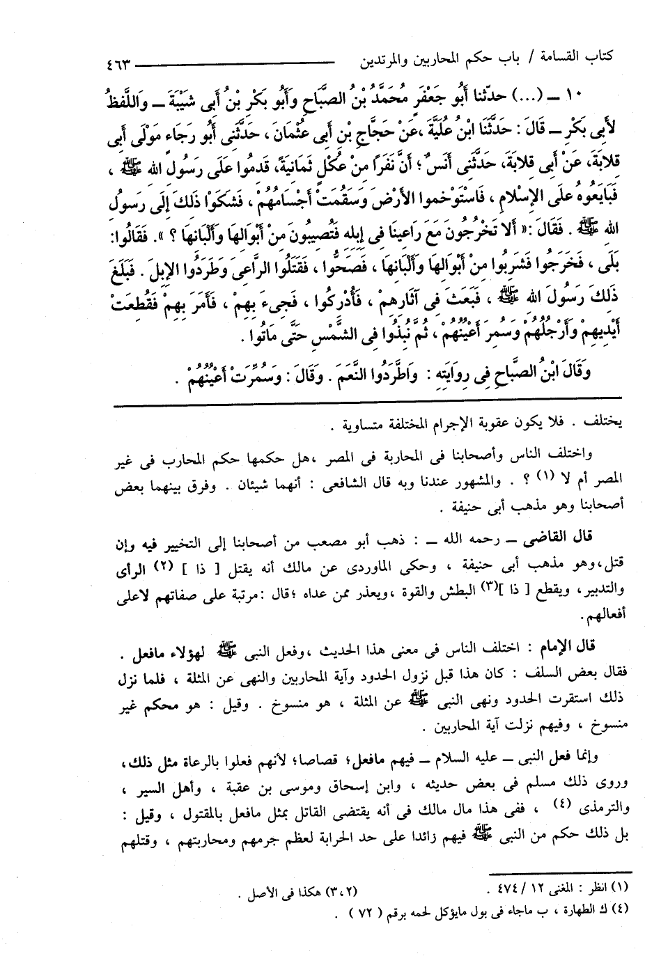 10 - (...) حدّثنا أَبُو جَعْفَرٍ مُحَمَّدُ بْنُ الصَّبَاحِ وَأَبُو بَكْرِ بْنُ أَبِى شَيْبَةَ - وَاللَّفْظُ لأَبِى بَكْرِ - قَالَ: حَدَّثنَا ابْنُ عُلَيَّةَ، عَنْ حَجَّاجِ بْنِ أَبِى عُثْمَانَ، حَدَّثَنِى أَبُو رَجَاءٍ مَوْلَى أَبِى قِلابَةَ، عَنْ أَبِى قِلابَةَ، حَدَّثَنِى أَنَسٌ؛ أَنَّ نَفَرًا مِنْ عُكْلٍ ثَمَانِيَةً، قَدِمُوا عَلَى رَسُولَ اللهِ صَلَّى اللهُ عَلَيْهِ وَسَلَّمَ، فَبَايَعُوهُ عَلَى الإِسْلامِ، فَاسْتَوْخَموا الأَرْضَ وَسَقُمَتْ أَجْسَامُهُمْ، فَشَكَوْا ذَلِكَ إِلَى رَسوُلِ اللهِ صَلَّى اللهُ عَلَيْهِ وَسَلَّمَ. فَقَالَ: " أَلا تَخْرُجُونَ مَعَ رَاعِينَا فِى إِبِلِهِ فَتُصِيبُونَ مِنْ أَبْوَالِهَا وَأَلْبَانِهَا؟ ". فَقَالُوا: بَلَىَ، فَخَرَجُوا فَشَرِبُوا منْ أَبْوَالِهَا وَأَلْبَانِهَا، فَصَحُّوا، فَقَتَلُوا الرَّاعِىَ وَطَرَدُوا الإِبِلَ. فَبَلَغَ ذَلِكَ رَسُولَ اللهِ صَلَّى اللهُ عَلَيْهِ وَسَلَّمَ، فَبَعَثَ فِى آثَارِهِمْ، فَأُدْرِكُوا، فَجِىءَ بِهِمْ، فَأَمَرَ بِهِمْ فَقُطِعَتْ أَيْدِيهِمْ وَأَرْجُلُهُمْ وَسُمِرَ أَعْيُنُهُمْ، ثُمَّ نُبِذُوا فِى الشَّمْسِ حَتَّى مَاتُوا.
