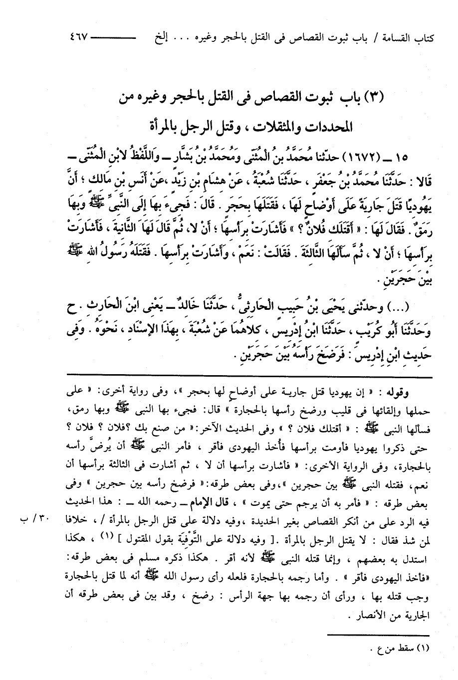(3) باب ثبوت القصاص فى القتل بالحجر وغيره من المحددات والمثقلات، وقتل الرجل بالمرأة
