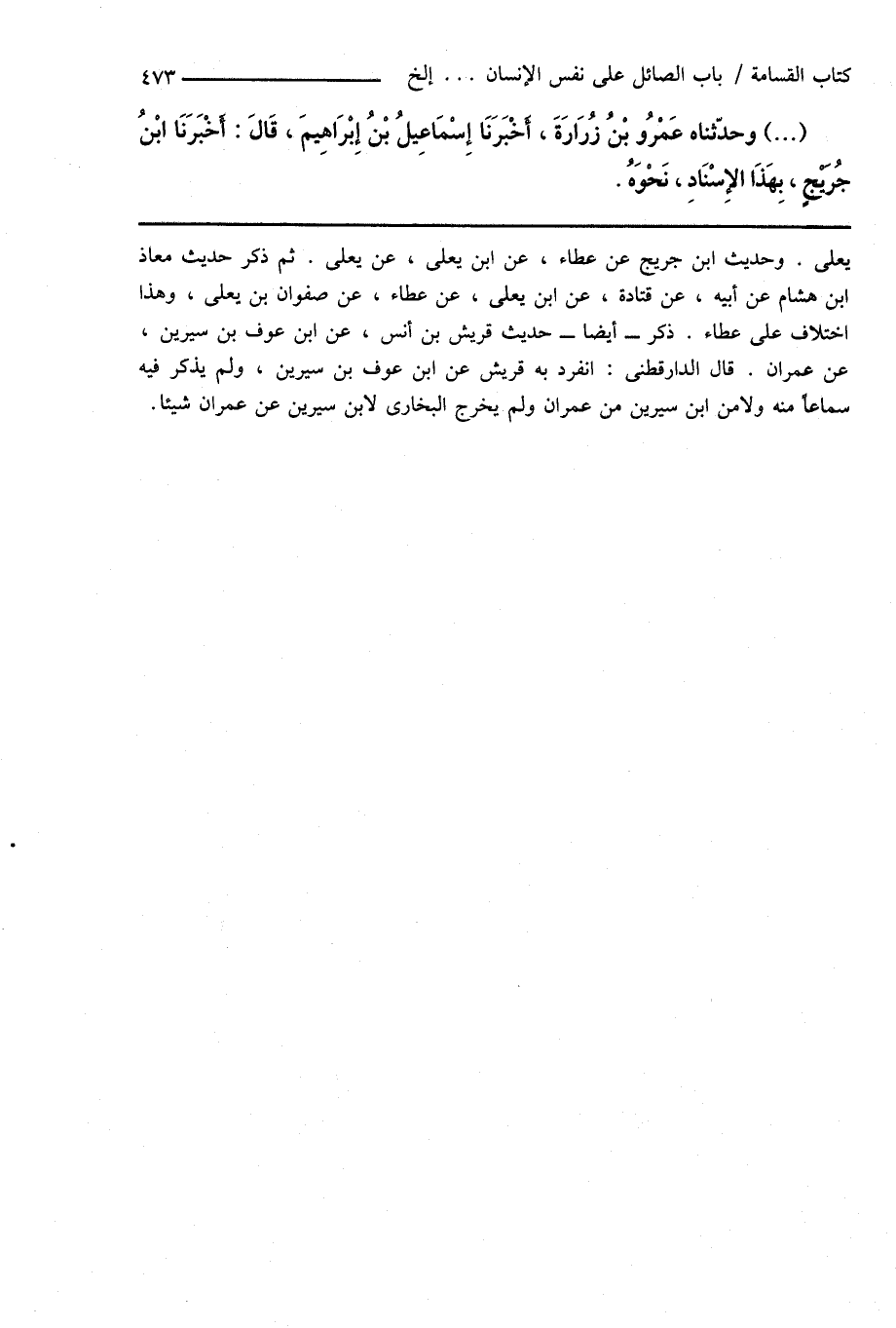 يعلى. وحديث ابن جريج عن عطاء، عن ابن يعلى، عن يعلى. ثم ذكر حديث معاذ ابن هشام عن أبيه، عن قتادة، عن ابن يعلى، عن عطاء، عن صفوان بن يعلى، وهذا اختلاف على عطاء. ذكر - أيضاً - حديث قريش بن أنس، عن ابن عوف بن سيرين، عن عمران. قال الدارقطنى: انفرد به قريش عن ابن عوف بن سيرين، ولم يذكر فيه سماعاً منه ولا من ابن سيرين من عمران ولم يخرج البخارى لابن سيرين عن عمران شيئًا.