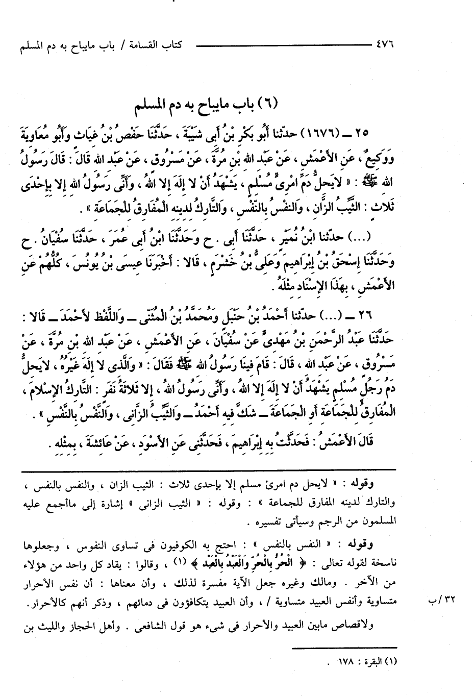 26 - (...) حدّثنا أَحْمَدُ بْنُ حَنْبَلٍ وَمُحَمَّدُ بْنُ الْمُثَنَّى - وَاللَّفْظُ لأَحْمَدَ - قَالا: حَدَّثَنَا عَبْدُ الرَّحْمَنِ بْنُ مَهْدِىٍّ عَنْ سُفْيَانَ، عَنِ الأَعْمَشِ، عَنْ عَبْدِ اللهِ بْنِ مُرَّةَ، عَنْ مَسْرُوقٍ، عَنْ عَبْدِ اللهِ، قَالَ: قَامَ فِينَا رَسُولُ اللهِ صَلَّى اللهُ عَلَيْهِ وَسَلَّمَ فَقَالَ: " وَالَّذِى لا إِلَهَ غَيْرُهُ، لا يَحِلُّ دَمُ رَجُلٍ مُسْلِمٍ يَشْهَدُ أَنْ لا إِلَهَ إِلا اللهُ، وَأَنِّى رَسُولُ الله، إِلا ثَلاثَةُ نَفَرٍ: التَّارِكُ الإِسْلامَ، الْمُفَارِق لِلْجَمَاعَةِ أَوِ الْجَمَاعَةَ - شَكَّ فِيهِ أَحْمَدُ - وَالثَّيِّبُ الزَّانِى، وَالنَّفْسُ بِالنَّفْسِ ".