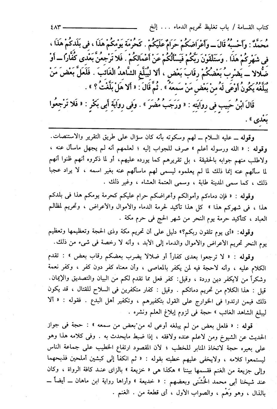 مُحَمَّدٌ: وَأَحْسِبُهُ قَالَ - وَأَعْرَاضَكُمْ حَرَامٌ عَلَيْكُمْ. كَحُرْمَةِ يَوْمِكُمْ هَذَا، فِى بَلَدِكُمْ هَذَا، فِى شَهْرِكُمْ هَذَا. وَسَتَلْقَوْنَ رَبَّكُمْ فَيَسْأَلُكُمْ عَنْ أَعْمَالِكُمْ. فَلَا تَرْجِعُنَّ بَعْدِى كُفَّارًا - أَوْ ضُلالاً - يَضْرِبُ بَعْضُكُمْ رِقَابَ بَعْضٍ، أَلا لِيُبَلَّغِ الشَّاهِدُ الْغَائِبَ. فَلَعَلَّ بَعْضَ مَنْ يُبَلَّغُهُ يَكُونُ أَوْعَى لَهُ مِنْ بَعْضِ مَنْ سَمِعَهُ ". ثُمَّ قَالَ: " أَلا هَلْ بَلَّغْتُ؟ ".