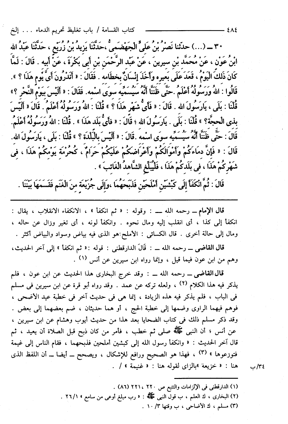 30 - (...) حدّثنا نَصْرُ بْنُ عَلِىٍّ الْجَهْضَمِىُّ، حَدَّثَنَا يَزِيدُ بْنُ زُرَيْعٍ، حَدَّثَنَا عَبْدُ اللهِ ابْنُ عَوْنٍ، عَنْ مُحَمَّدِ بْنِ سِيرينَ، عَنْ عَبْدِ الرَّحْمَنِ بْنِ أَبِى بَكْرَةَ، عَنْ أَبِيهِ. قَالَ: لَمَّا كَانَ ذَلِكَ الْيَوْمُ، قَعَدَ عَلَى بَعِيرِهِ وَأَخَذَ إِنْسَانٌ بِخِطَامِهِ. فَقَالَ: " أَتَدْرُونَ أَىَّ يَوْمٍ هَذَا؟ ". قَالُوا: اللهُ وَرَسُولُهُ أَعْلَمُ. حَتَّى ظَنَنَّا أَنَّهُ سَيُسَمِّيهِ سِوَى اسْمِهِ. فَقَالَ: " أَلَيْسَ بِيَوْمِ النَّحْرِ؟ " قُلْنَا: بَلَى، يَا رَسُولَ اللهِ. قَالَ: " فَأَىَّ شَهْرٍ هَذَا؟ " قُلْنَا: اللهُ وَرَسُولُهُ أَعْلَمُ. قَالَ " أَلَيْسَ بِذِى الْحِجَّةِ؟ " قُلْنَا: بَلَى. يَا رَسُولَ اللهِ؟ قَالَ: " فَأَىُّ بَلَدٍ هَذَا ". قُلْنَا: اللهُ وَرَسُولُهُ أَعْلَمُ. قَالَ: حَتَّى ظَنَنَّا أَنَّهُ سَيُسَمِّيهِ سِوَى اسْمِهِ. قَالَ: " أَلَيْسَ بِالْبَلْدَةِ؟ " قُلْنَا: بَلَى، يَا رَسُولَ اللهِ. قَالَ: " فَإِنَّ دِمَاءَكُمْ وَأَمْوَالَكُمْ وَأَعْرَاضَكُمْ عَلَيْكُمْ حَرَامٌ، كُحُرْمَةِ يَوْمِكُمْ هَذَا، فِى شَهْرِكُمْ هَذَا، فِى بَلَدِكُمْ هَذَا، فَلْيُبَلِّغِ الشَّاهِدُ الْغَائِبَ ".