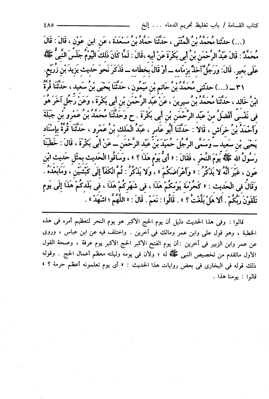 31 - (...) حدّثنى مُحَمَّدُ بْنُ حَاتِمِ بْنِ مَيْمُونِ، حَدَّثَنَا يَحْيَى بْنُ سَعِيدٍ، حَدَّثَنَا قُرَّةُ ابْنُ خَالِدٍ، حَدَّثَنَا مُحَمَّدُ بْنُ سِيرِينَ، عَنْ عَبْدِ الرَّحْمَنِ بْنِ أَبِى بَكْرَةَ، وَعَنْ رَجُلٍ آخَرَ هُوَ فِى نَفْسِى أَفْضَلُ مِنْ عَبْدِ الرَّحْمَنِ بْنِ أَبِى بَكْرَةَ. ح وَحَدَّثَنَا مُحَمَّدُ بْنُ عَمْرِو بْنِ جَبَلَةَ وَأَحْمَدُ بْنُ خِرَاشٍ، قَالَا: حَدَّثَنَا أَبُو عَامِرٍ، عَبْدُ الْمَلِكِ بْنُ عَمْرٍو، حَدَّثَنَا قُرَّةُ بِإِسْنَادِ يَحْيَى بْنِ سَعِيدٍ - وَسَمَّى الرَّجُلَ حُمَيْدَ بْنَ عَبْدِ الرَّحْمَنِ - عَنْ أَبِى بَكْرَةَ، قَالَ: خَطَبَنَا رَسُولُ اللهِ صَلَّى اللهُ عَلَيْهِ وَسَلَّمَ يَوْمَ النَّحْرِ، فَقَالَ: " أَىُّ يَوْمٍ هَذَا؟ "، وَسَاقُوا الْحَدِيثِ بِمِثْلِ حَدِيثِ ابْنِ عَونٍ، غَيْرَ أَنَّهُ لا يَذْكُرُ: " وَأَعْرَاضَكُمْ "، وَلا يَذْكُرُ: ثُمَّ انْكَفَأَ إِلَى كَبْشَيْنِ، وَمَا بَعْدَهُ. وَقَالَ فِى الْحَدِيثِ: " كَحُرْمَةِ يَوْمِكُمْ هَذَا، فِى شَهْرِكُمْ هَذَا، فِى بَلَدِكُمْ هَذَا إِلَى يَوْمِ تَلْقَوْنَ رَبَّكُمْ. أَلا هَلْ بَلَّغْتُ؟ ". قَالُوا: نَعَمْ. قَالَ: " اللَّهُمَّ؛ اشْهَدْ ".