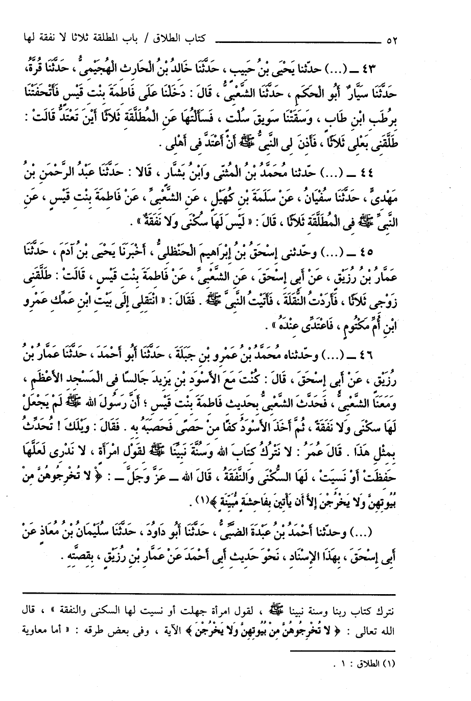 46 - (...) وحدّثناه مُحَمَّدُ بْنُ عَمْرِو بْنِ جَبَلَةَ، حَدَّثَنَا أَبُو أَحْمَدَ، حَدَّثَنَا عَمَّارُ بْنُ رُزَيْقٍ، عَنْ أَبِى إِسْحَاقَ، قَالَ: كُنْتَ مَعَ الأَسْوَدِ بْنِ يَزِيدَ جَالِسًا فِى الْمَسْجِد الأَعْظَمِ، وَمَعَنَا الشَّعْبِىُّ، فَحَدَّثَ الشَّعْبِىُّ بِحَدِيثِ فَاطِمَةَ بِنْتِ قَيْسٍ؛ أَنَّ رَسُولَ اللهِ صَلَّى اللهُ عَلَيْهِ وَسَلَّمَ لَمْ يَجْعَلْ لَهَا سُكْنَى وَلا نَفَقَةً، ثُمَّ أَخَذَ الأَسْوَدُ كفًّا مِنْ حَصًى فَحَصَبَهُ بِهِ. فَقَالَ: وَيْلَكَ! تُحَدِّثُ بِمِثْلِ هَذَا. قَالَ عُمَرُ: لا نَتْرُكُ كِتَابَ اللهِ وَسُنَّةَ نَبِيِّنَا صَلَّى اللهُ عَلَيْهِ وَسَلَّمَ لِقَوْلِ امْرَأَةٍ، لا نَدْرِى لَعَلَّهَا حَفِظَتْ أَوْ نَسِيَتْ، لَهَا السُّكْنَى وَالنَّفَقَةُ، قَالَ اللهُ - عَزَّ وَجَلَّ -: {لا تُخْرِجُوهُنَّ مِنْ بُيُوتِهِنَّ وَلا يَخْرُجْنَ إِلَّا أَن يَأتِينَ بِفَاحِشَةٍ مُّبَيِّنَةٍ} (¬1).