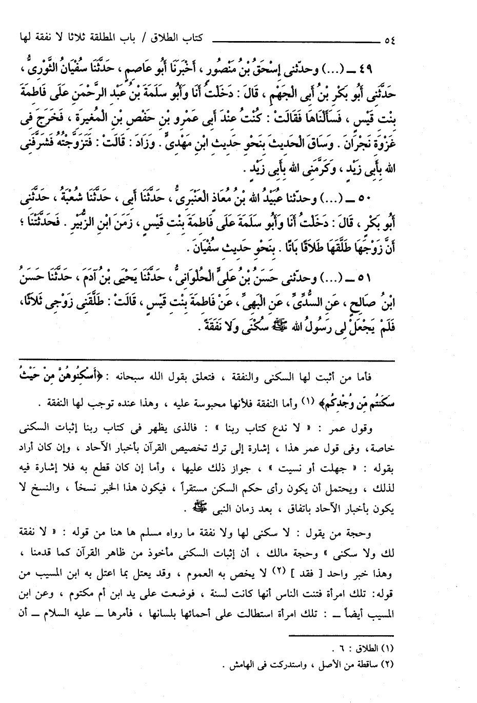 51 - (...) وحدّثنى حَسَنُ بْنُ عَلِىٍّ الْحُلْوَانِىُّ، حَدَّثَنَا يَحْيَى بْنُ آدَمَ، حَدَّثَنَا حَسَنُ ابْنُ صَالِحٍ، عَنِ السُّدِّىِّ، عَنِ الْبَهِىِّ، عَنْ فَاطِمَةَ بِنْتِ قَيْسٍ، قَالَتْ: طَلَّقَنِى زَوْجِى ثَلاثًا، فَلَمْ يَجْعَلْ لِى رَسُولُ اللهِ صَلَّى اللهُ عَلَيْهِ وَسَلَّمَ سُكْنَى وَلا نَفَقَةً.
