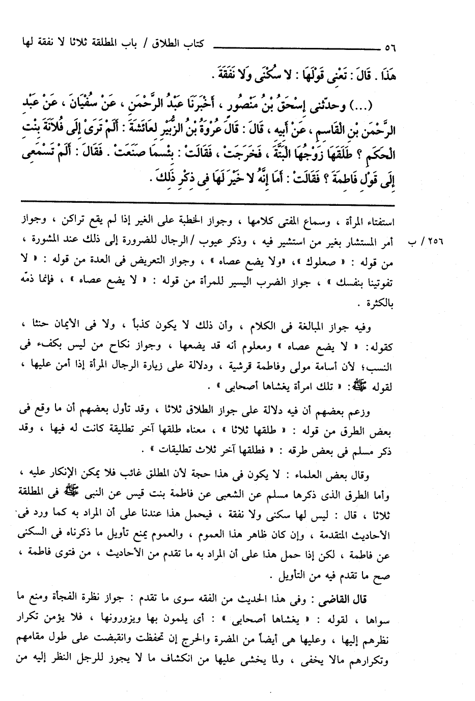 (...) وحدّثنى إِسْحَاقُ بْنُ مَنْصُورٍ، أَخْبَرَنَا عَبْدُ الرَّحْمَنِ، عَنْ سُفْيَانَ، عَنْ عَبْدِ الرَّحْمَن بْنِ الْقَاسِمِ، عَنْ أَبِيهِ، قَالَ: قَالَ عُرْوَةُ بْنُ الزُّبَيْرِ لِعَائَشَةَ: أَلَمْ تَرَىْ إِلَى فُلاَنَةَ بِنْتِ الْحَكَمِ؛ طَلَّقَهَا زَوْجُهَا الْبَتَّةَ، فَخَرَجَتْ، فَقَالَتْ: بِئْسمَا صَنَعَتْ. فَقَالَ: أَلَمْ تَسْمَعِى إِلَى قَوْلِ فَاطِمَةَ؟ فَقَالَتْ: أَمَا إِنَّهُ لا خَيْرَ لَهَا فِى ذِكْرِ ذَلِكَ.