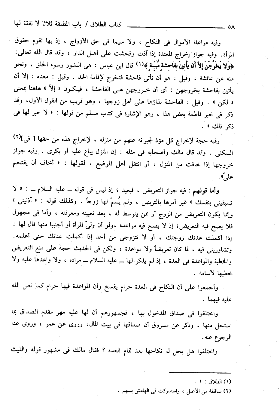 وفيه مراعاة الأموال فى النكاح، ولا سيما فى حق الأزواج، إذ بها تقوم حقوق المرأة. وفيه جواز إخراج المعتدة إذا آذت وفحشت على أهل الدار، وقد قال الله تعالى: {وَلا يَخْرُجْنَ إِلَّا أَن يَأْتِينَ بِفَاحِشَةٍ مُّبَيِّنَةٍ} (¬1) قال ابن عباس: هى النشوز وسوء الخلق، ونحو منه عن عائشة، وقيل: هو أن تأتى فاحشة فتخرج لإقامة الحد. وقيل: معناه: إلا أن يأتين بفاحشة بخروجهن: أى أن خروجهن هى الفاحشة، فيكون " إلّا " هاهنا بمعنى " لكن ". وقيل: الفاحشة بذاؤها على أهل زوجها، وهو قريب من القول الأول، وقد ذكر فى خبر فاطمة بعض هذا، وهو الإشارة فى كتاب مسلم من قولها: " لا خير لها فى ذكر ذلك ".