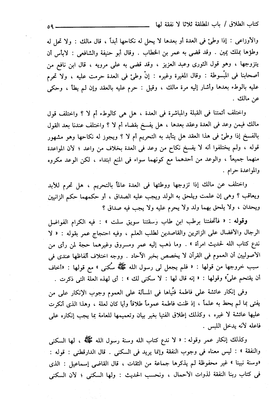 وكذلك إنكار عمر وقوله: " لا ندع كتاب الله وسنة رسول الله صَلَّى اللهُ عَلَيْهِ وَسَلَّمَ، لها السكنى والنفقة ": ليس معناه فى وجوب النفقة وإنما يريد فى السكنى. قال الدارقطنى: قوله: " وسنة نبينا " غير محفوظة لم يذكرها جماعة من الثقات، قال القاضى إسماعيل: الذى فى كتاب ربنا النفقة لذوات الأحمال، ونحسب الحديث: ولها السكنى؛ لأن السكنى