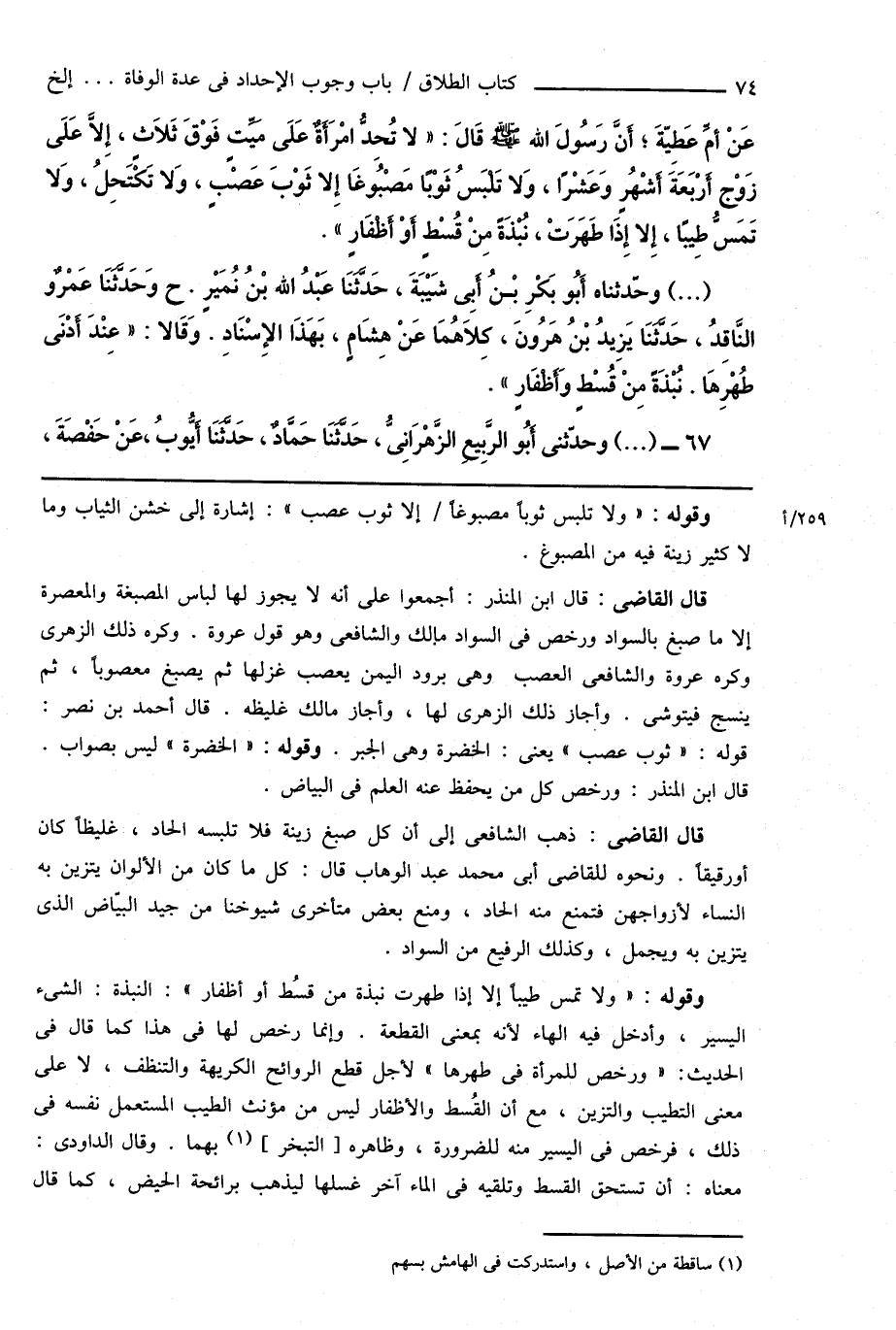 عَنْ أُمِّ عَطِيَّةَ؛ أَنَّ رَسُولَ اللهِ صَلَّى اللهُ عَلَيْهِ وَسَلَّمَ قَالَ: " لا تُحِدُّ امْرَأَةٌ عَلَى مَيِّتٍ فَوْقَ ثَلاثٍ، إِلَّا عَلَى زَوْجٍ أَرْبَعَةَ أَشْهُرٍ وَعَشْرًا، وَلا تَلْبَسُ ثَوْبًا مَصْبُوغًا إِلا ثَوْبَ عَصْبٍ، وَلا تَكْتَحِلُ، وَلا تَمَسُّ طِيبًا، إِلا إِذَا طَهَرَتْ، نُبْذَةً مِنْ قُسْطٍ أَوْ أَظْفَارٍ ".
