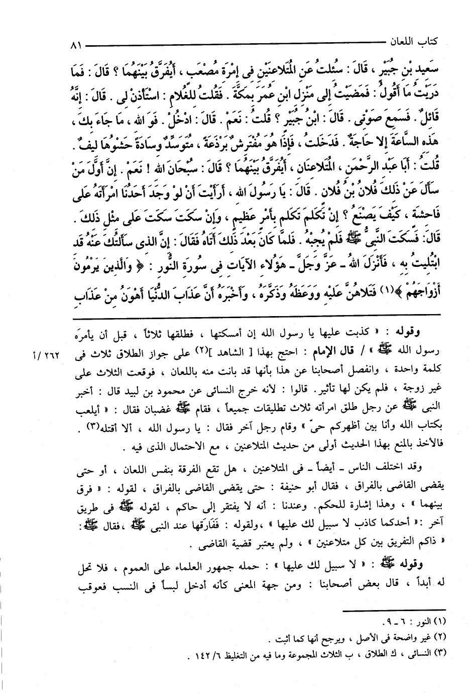 سَعِيدِ بْنِ جُبَيْرٍ، قَالَ: سُئِلتُ عَنِ المُتَلاعِنَيْنِ فِى إمْرَةِ مُصْعَبٍ، أَيُفَرَّقُ بَيْنَهُمَا؟ قَالَ: فَمَا دَرَيْتُ مَا أَقُولُ: فَمَضَيْتُ إِلى مَنْزِلِ ابْنِ عُمَرَ بِمَكَّةَ. فَقُلْتُ لِلغُلامِ: اسْتَأذِنْ لِى. قَالَ: إِنَّهُ قَائِلٌ. فَسَمِعَ صَوْتِى. قَالَ: ابْنُ جُبَيْرٍ؟ قُلْتُ: نَعَمْ. قَالَ: ادْخُلْ. فَوَ اللهِ، مَا جَاءَ بِكَ، هَذِهِ السَّاعَةَ إِلا حَاجَةٌ. فَدَخَلْتُ، فَإِذَا هُوَ مُفْتَرِشٌ بَرْذَعَةً، مُتَوَسِّدٌ وِسَادَةً حَشْوُهَا لِيفٌ. قُلْتُ: أَبَا عَبْدِ الرَّحْمَنِ، المُتَلاعِنَانِ، أَيُفَرَّقُ بَيْنَهُمَا؟ قَالَ: سُبْحَانَ اللهِ! نَعَمْ. إِنَّ أَوَّلَ مَنْ سَأَلَ عَنْ ذَلِكَ فُلانُ بْنُ فُلانٍ. قَالَ: يَا رَسُولَ اللهِ، أَرَأَيْتَ أَنْ لَوْ وَجَدَ أَحَدُنَا امْرَأَتَهُ عَلى فَاحِشَةٍ، كَيْفَ يَصْنَعُ؟ إِنْ تَكَلَّمَ تَكَلَّمَ بِأَمْرٍ عَظِيمٍ، وَإِنْ سَكَتَ سَكَتَ عَلى مِثْلِ ذَلِكَ. قَالَ: فَسَكَتَ النَّبِىُّ صَلَّى اللهُ عَلَيْهِ وَسَلَّمَ فَلمْ يُجِبْهُ. فَلَمَّا كَانَ بَعْدَ ذَلِكَ أَتَاهُ فَقَالَ: إِنَّ الَّذِى سَأَلْتُكَ عَنْهُ قَدِ ابْتُلِيتُ بِهِ، فَأَنْزَلَ اللهُ - عَزَّ وَجَلَّ - هَؤُلاءِ الآيَاتِ فِى سُورَةِ النُّورِ: {وَالَّذِينَ يَرْمُونَ أَزْوَاجَهُمْ} (¬1) فَتَلاهُنَّ عَليْهِ وَوَعَظَهُ وَذَكَّرَهُ، وَأَخْبَرَهُ أَنَّ عَذَابَ الدُّنْيَا أَهْوَنُ مِنْ عَذَابِ