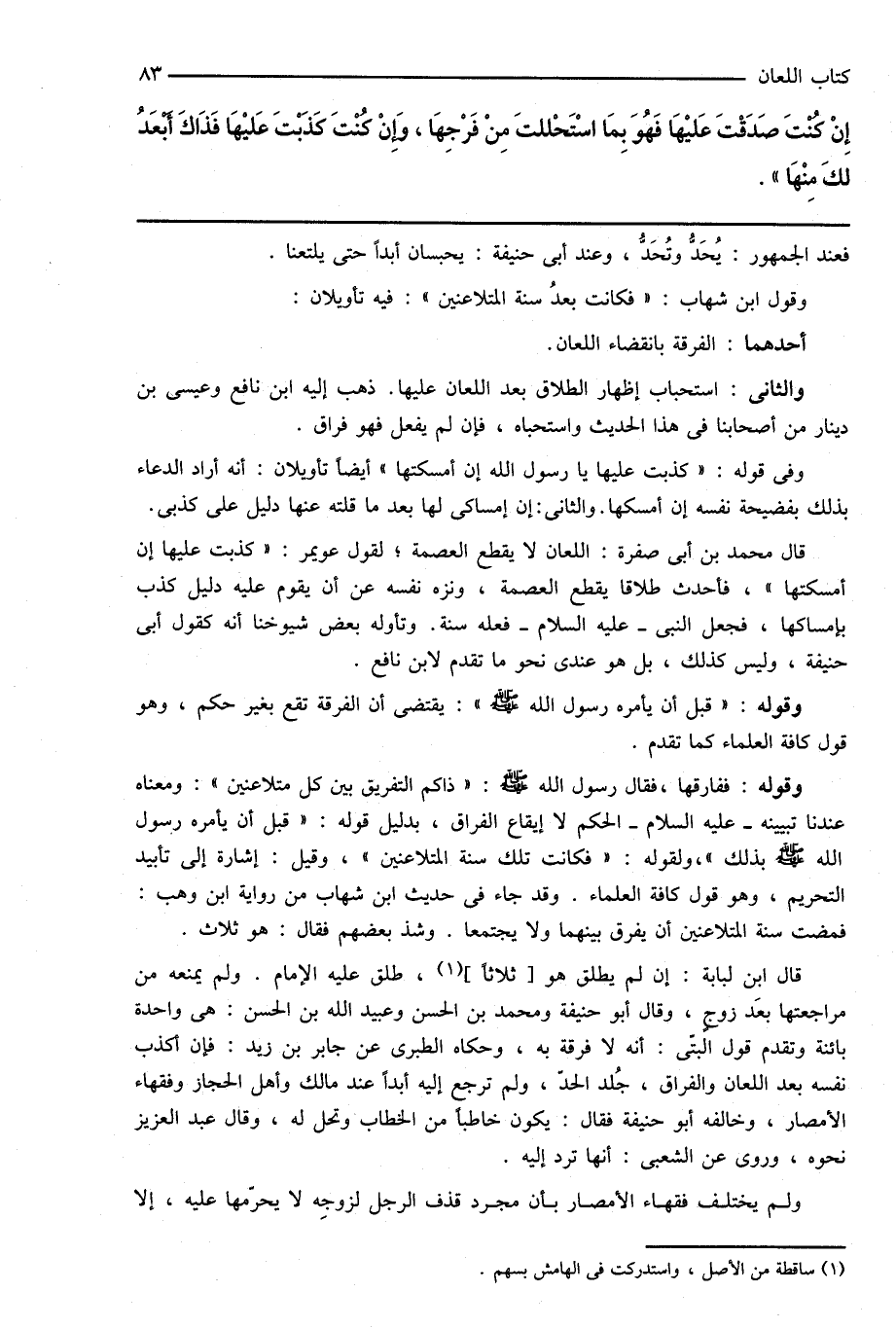 قال محمد بن أبى صفرة: اللعان لا يقطع العصمة؛ لقول عويمر: " كذبت عليها إن أمسكتها "، فأحدث طلاقاً يقطع العصمة، ونزه نفسه عن أن يقوم عليه دليل كذب بإمساكها، فجعل النبى - عليه السلام - فعله سنة. وتأوله بعض شيوخنا أنه كقول أبى حنيفة، وليس كذلك، بل هو عندى نحو ما تقدم لابن نافع.