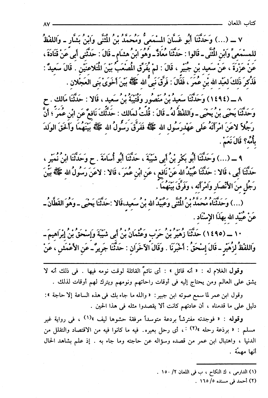 8 - (1494) وَحَدَّثَنَا سَعِيدُ بْنُ مَنْصُورٍ وَقُتَيْبَةُ بْنُ سَعِيدٍ، قَالا: حَدَّثَنَا مَالِكٍ. ح وَحَدَّثَنَا يَحْيَى بْنُ يَحْيَى - وَاللفْظُ لَهُ - قَالَ: قُلْتُ لِمَالِكٍ: حَدَّثَكَ نَافِعٌ عَنِ ابْنِ عُمَرَ؛ أَنَّ رَجُلاً لاعَنَ امْرَأَتَهُ عَلى عَهْدِ رَسُولِ اللهِ صَلَّى اللهُ عَلَيْهِ وَسَلَّمَ فَفَرَّقَ رَسُولُ اللهِ صَلَّى اللهُ عَلَيْهِ وَسَلَّمَ بَيْنَهُمَا وَأَلحَقَ الوَلدَ بِأُمِّهِ؟ قَالَ نَعَمْ.