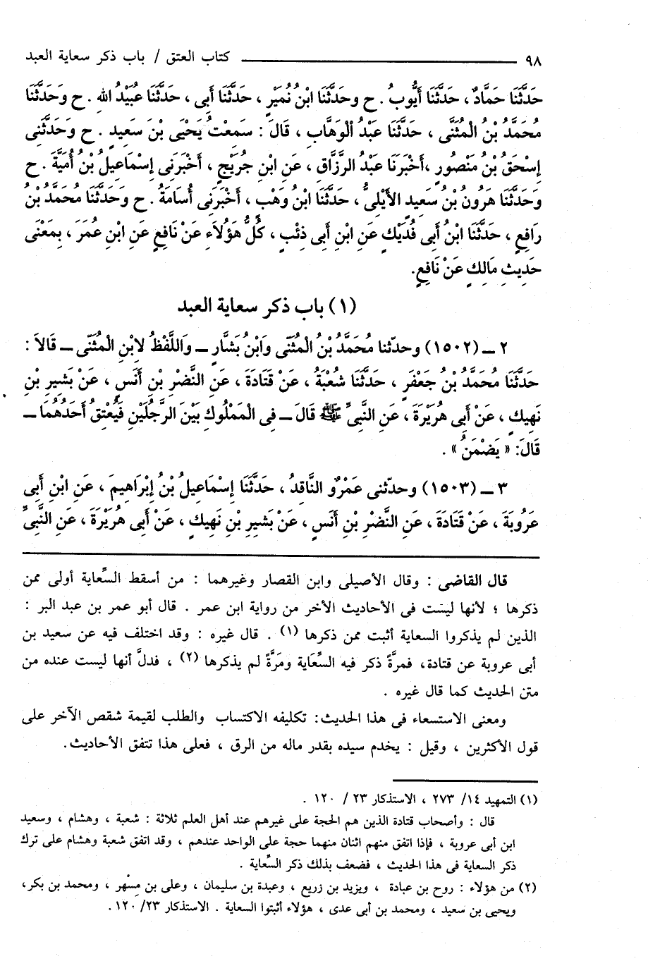 (¬2) من هؤلاء: روح بن عبادة، ويزيد بن زريع، وعبدة بن سليمان، وعلى بن مِسْهر، ومحمد بن بكر، ويحيى بن سعيد، ومحمد بن أبى عدى، هؤلاء أثبتوا السعاية. الاستذكار 23/ 120.