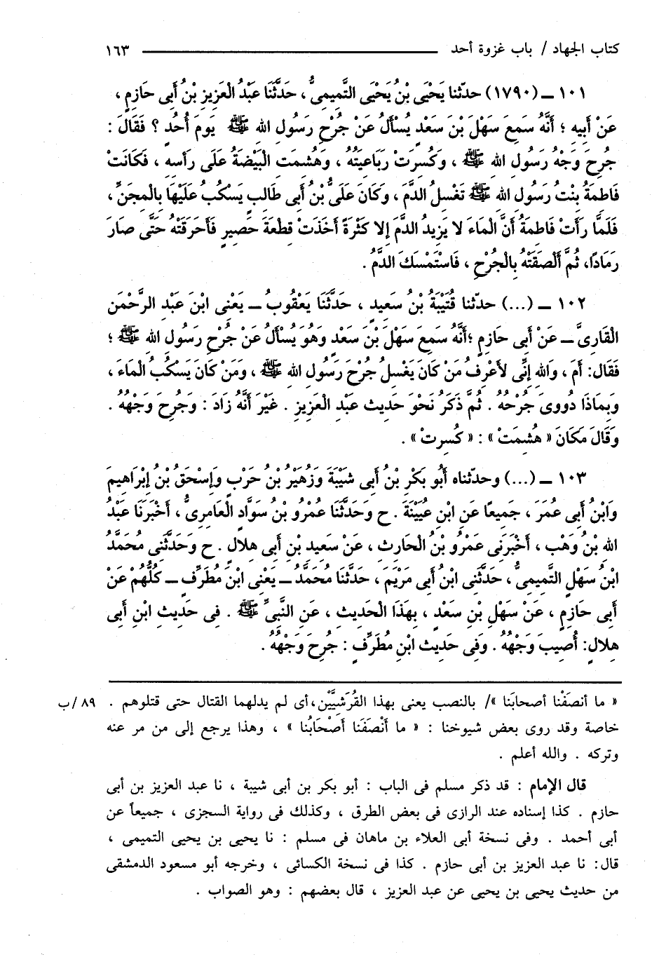 103 - (...) وحدّثناه أَبُو بَكْرِ بْنُ أَبِى شَيْبَةَ وَزُهَيْرُ بْنُ حَرْبٍ وَإِسْحَاقُ بْنُ إِبْرَاهِيمَ وَابْنُ أَبِى عُمَرَ، جَمِيعًا عَنِ ابْنِ عُيَيْنَةَ. ح وَحَدَّثَنَا عُمْرُو بْنُ سَوَّادٍ الْعَامِرِىُّ، أَخْبَرَنَا عَبْدُ اللهِ بْنُ وَهْبٍ، أَخْبَرَنِى عَمْرُو بْنُ الْحَارِثِ، عَنْ سَعِيدِ بْنِ أَبِى هِلالٍ. ح وَحَدَّثَنِى مُحَمَّدُ ابْنُ سَهْلٍ التَّمِيمِىُّ، حَدَّثَنِى ابْنُ أَبِى مَرْيَمَ، حَدَّثنَا مُحَمَّدُ - يَعْنِى ابْنَ مُطَرِّفٍ - كُلُّهُمْ عَنْ أَبِى حَازِمٍ، عَنْ سَهْلِ بْنِ سَعْدٍ، بِهَذَا الْحَدِيثِ، عَنِ النَّبِىِّ صَلَّى اللهُ عَلَيْهِ وَسَلَّمَ. فِى حَدِيثِ ابْنِ أَبِى هِلالٍ: أُصِيبَ وَجْهُهُ. وَفِى حَدِيث ابْنِ مُطَرِّفٍ: جُرِحَ وَجْهُهُ.