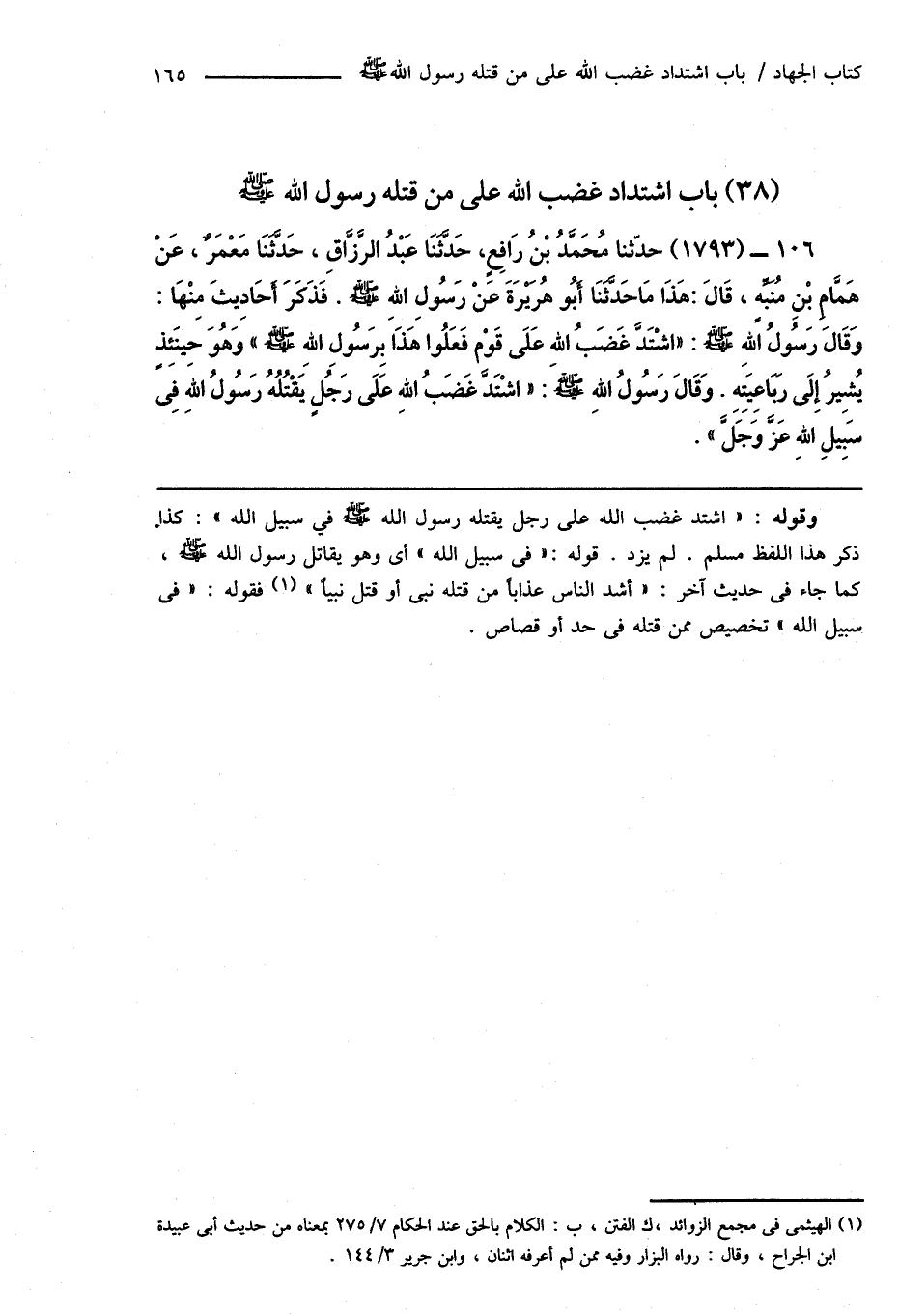 106 - (1793) حدَّثنا مُحَمَّدُ بْنُ رَافِعٍ، حَدَّثَنَا عَبْدُ الرَّزَّاقِ، حَدَّثَنَا مَعْمَرٌ، عَنْ هَمَّامِ بْنِ مُنَبِّهٍ، قَالَ: هَذَا مَا حَدَّثَنَا أَبُو هُرَيْرَةَ عَنْ رَسُولِ اللهِ صَلَّى اللهُ عَلَيْهِ وَسَلَّمَ. فَذَكَرَ أحَادِيثَ مِنْهَا: وَقَالَ رَسُولُ اللهِ صَلَّى اللهُ عَلَيْهِ وَسَلَّمَ: " اشْتَدَّ غَضَبُ اللهِ عَلَى قَوْم فَعَلُوا هَذَا بِرَسُولِ اللهِ صَلَّى اللهُ عَلَيْهِ وَسَلَّمَ " وَهُوَ حِينَئِذٍ يُشِيرُ إِلَى رَبَاعِيَتِهِ. وَقَالَ رَسُولُ اللهِ صَلَّى اللهُ عَلَيْهِ وَسَلَّمَ: " اشْتَدَّ غَضَبُ اللهِ عَلَى رَجُلٍ يَقْتُلُهُ رَسُولُ اللهِ فِى سَبِيلِ اللهِ عَزَّ وَجَلَّ ".