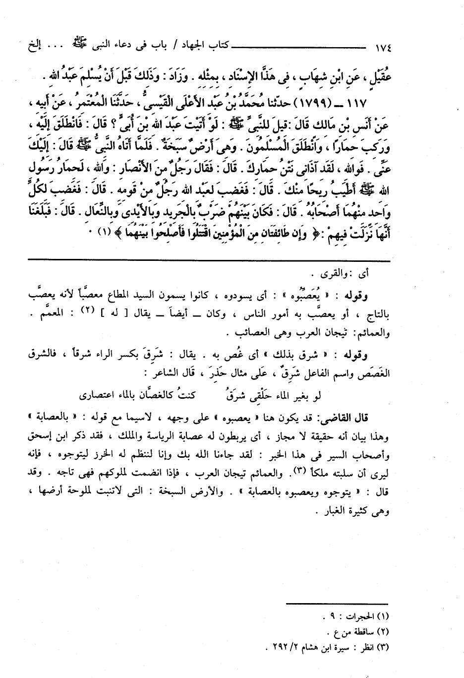 117 - (1799) حدَّثنا مُحَمَّدُ بْنُ عَبْدِ الأَعْلَى الْقَيْسِىُّ، حَدَّثَنَا الْمُعْتَمِرُ، عَنْ أَبِيهِ، عَنْ أَنَسِ بْنِ مَالِكٍ قَالَ: قِيلَ لِلنَّبِىِّ صَلَّى اللهُ عَلَيْهِ وَسَلَّمَ: لَوْ أتَيْتَ عَبْدَ اللهِ بْنَ أُبَىٍّ؟ قَالَ: فَانْطَلَقَ إِلَيْهَ، وَرَكِبَ حمَارًا، وَانْطَلَقَ الْمُسْلِمُونَ. وَهِىَ أَرْضٌ سَبَخَةٌ. فَلَمَّا أَتَاهُ النَّبِىُّ صَلَّى اللهُ عَلَيْهِ وَسَلَّمَ قَالَ: إِلَيْكَ عَنِّى. فَواللهِ، لَقَدِ آذَانِى نَتْنُ حِمَارِكَ. قَالَ: فَقَالَ رَجُلٌ مِنَ الأَنْصَارِ: وَاللهِ، لَحِمَارُ رسُولِ اللهِ صَلَّى اللهُ عَلَيْهِ وَسَلَّمَ أَطْيَبُ رِيحًا مِنْكَ. قَالَ: فَغَضِبَ لِعَبْدِ اللهِ رَجُلٌ مِنْ قَومِهِ. قَالَ: فَغَضِبَ لِكُلِّ وَاحَدٍ مِنْهُمَا أَصْحَابُهُ. قَالَ: فَكَانَ بَيْنَهُمْ ضَرْبٌ بِالْجَرِيدِ وَبِالأَيْدِى وَبِالنِّعَالِ. قَالَ: فَبَلَغَنَا أَنَّهَا نَزَلَتْ فِيهِمْ: {وَإِن طَائِفَتَانِ مِنَ الْمُؤْمِنِينَ اقْتَتَلُوا فَأَصْلِحُوا بَيْنَهُمَا} (¬1).