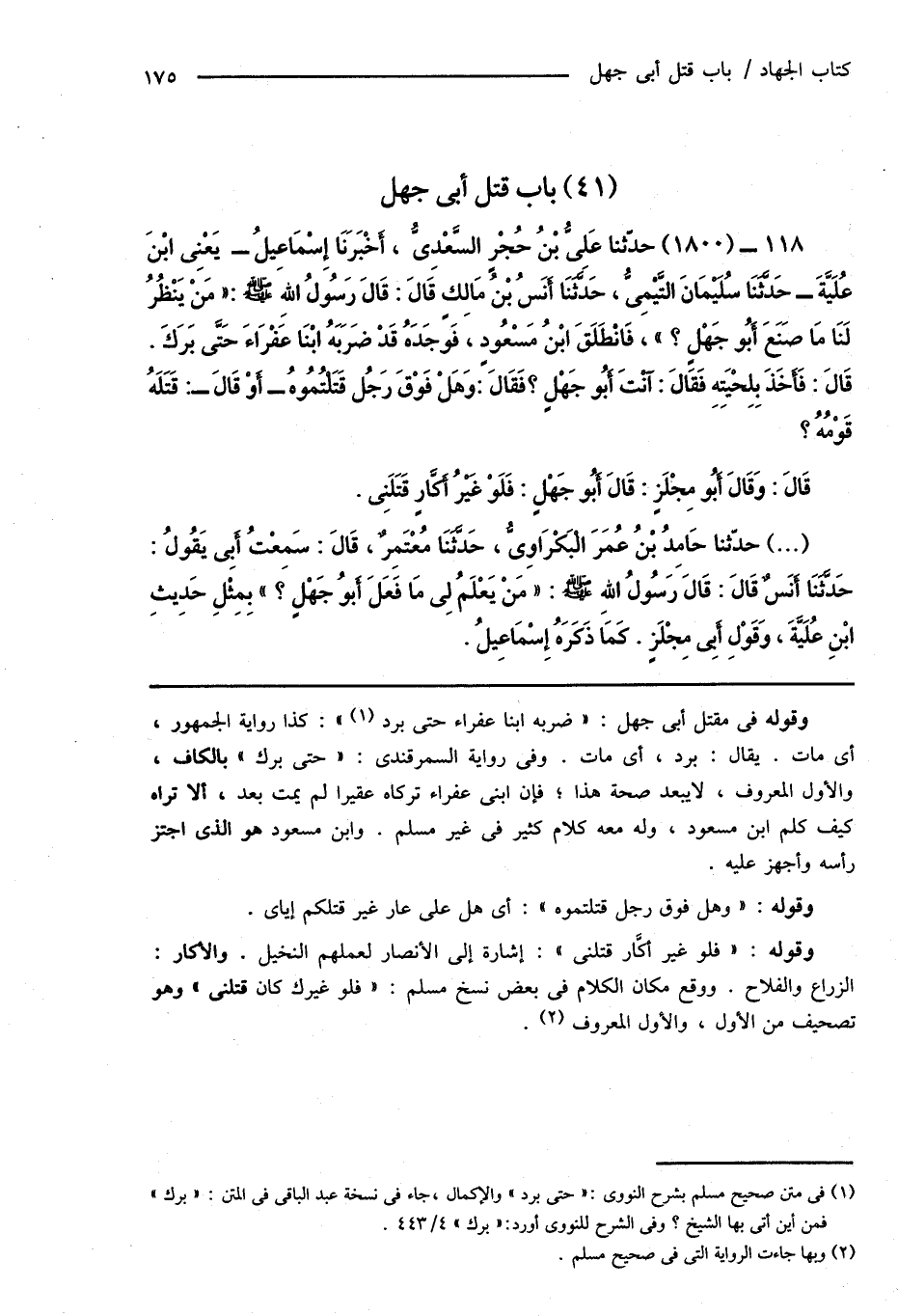 118 - (1800) حدَّثنا عَلِىُّ بْنُ حُجْرٍ السَّعْدِىُّ، أَخْبَرَنَا إِسْمَاعِيلُ - يَعْنِى ابْنَ عُلَيَّةَ - حَدَّثَنَا سُلَيْمَانَ التَّيْمِىُّ، حَدَّثَنَا أَنَسُ بْنُ مَالِكٍ قَالَ: قَالَ رَسُولُ اللهِ صَلَّى اللهُ عَلَيْهِ وَسَلَّمَ: " مَنْ يَنْظُرُ لَنَا مَا صَنَعَ أَبُو جَهْلٍ؟ "، فَانْطَلَقَ ابْنُ مَسْعُودٍ، فَوجَدَهُ قَدْ ضَرَبَهُ ابْنَا عَفْرَاءَ حَتَّى بَرَكَ. قَالَ: فَأَخَذَ بِلِحْيَتِهِ فَقَالَ: آنْتَ أَبُو جَهْلٍ؟ فَقَالَ: وَهَلْ فَوْقَ رَجُل قَتَلْتُمُوهُ - أَوْ قَالَ -: قَتَلَهُ قَوْمُهُ؟