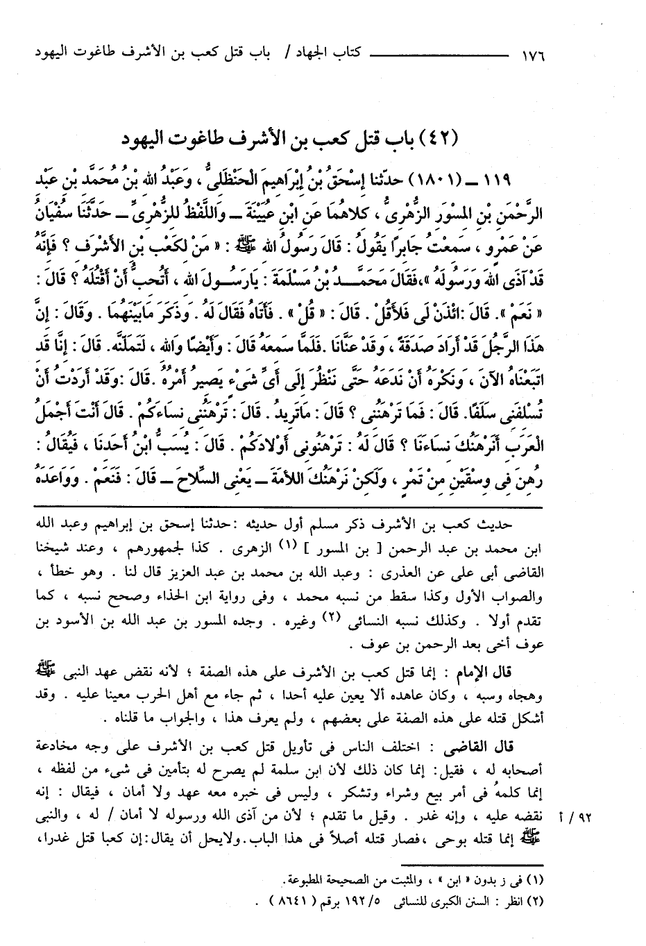 119 - (1801) حدَّثنا إِسْحَاقُ بْنُ إِبْرَاهِيمَ الْحَنْظَلِىُّ، وَعَبْدُ اللهِ بْنُ مُحَمَّدِ بْنِ عَبْدِ الرَّحْمَنِ بْنِ المِسْوَرِ الزُّهْرِىُّ، كِلاهُمَا عَنِ ابْنِ عُيَيْنَةَ - وَاللَّفْظُ للِزُهْرِىِّ - حَدَّثَنَا سُفْيَانُ عَنْ عَمْرٍو، سَمِعْتُ جَابِرًا يَقُولُ: قَالَ رَسُولُ اللهِ صَلَّى اللهُ عَلَيْهِ وَسَلَّمَ: " مَنْ لِكَعْب بْنِ الأَشْرَفِ؟ فَإِنَّهُ قَدْ آذَى اللهَ وَرَسُولَهُ "، فَقَالَ مَحَمَّدُ بْنُ مَسْلَمَةَ: يَا رَسُولَ اللهِ، أَتُحِبُّ أَنْ أَقْتُلَهُ؟ قَالَ: " نَعَمْ ". قَالَ: ائْذَنْ لِى فَلأَقُلْ. قَالَ: " قُلْ ". فَأَتَاهُ فَقَالَ لَهُ. وَذَكَرَ مَا بَيْنَهُمَا. وَقَالَ: إِنَّ هَذَا الرَّجُلَ قَدْ أَرَادَ صَدَقَةً، وَقَدْ عَنَّانَا. فَلَمَّا سَمِعَهُ قَالَ: وَأَيْضًا وَاللهِ، لَتَمَلّنَّه. قَالَ: إِنَّا قَدِ اتَّبَعْنَاهُ الآنَ، وَنَكْرَهُ أَنْ نَدَعَهُ حَتَّى نَنْظُرَ إِلَى أَىِّ شَىْءٍ يَصِيرُ أَمْرُهُ. قَالَ: وَقَدْ أَرَدْتُ أَنْ تُسْلِفَنِى سَلَفًا. قَالَ: فَمَا تَرْهَنُنِى؟ قَالَ: مَا تَرِيدُ. قَالَ: تَرْهَنُنِى نِسَاءَكُمْ. قَالَ أَنْتَ أَجْمَلُ الْعَرَبِ أَنَرْهَنُكَ نِسَاءَنَا؟ قَالَ لَهُ: تَرْهَنُونِى أَوْلادَكُمْ. قَالَ: يُسَبُّ ابْنُ أَحَدِنَا، فَيُقَالُ: رُهِنَ فِى وِسْقَيْنِ مِنْ تَمْرٍ، وَلَكِنْ نَرْهَنُكَ اللأمَةَ - يَعْنِى السَّلاحَ - قَالَ: فَنَعَمْ. وَوَاعَدَهُ
