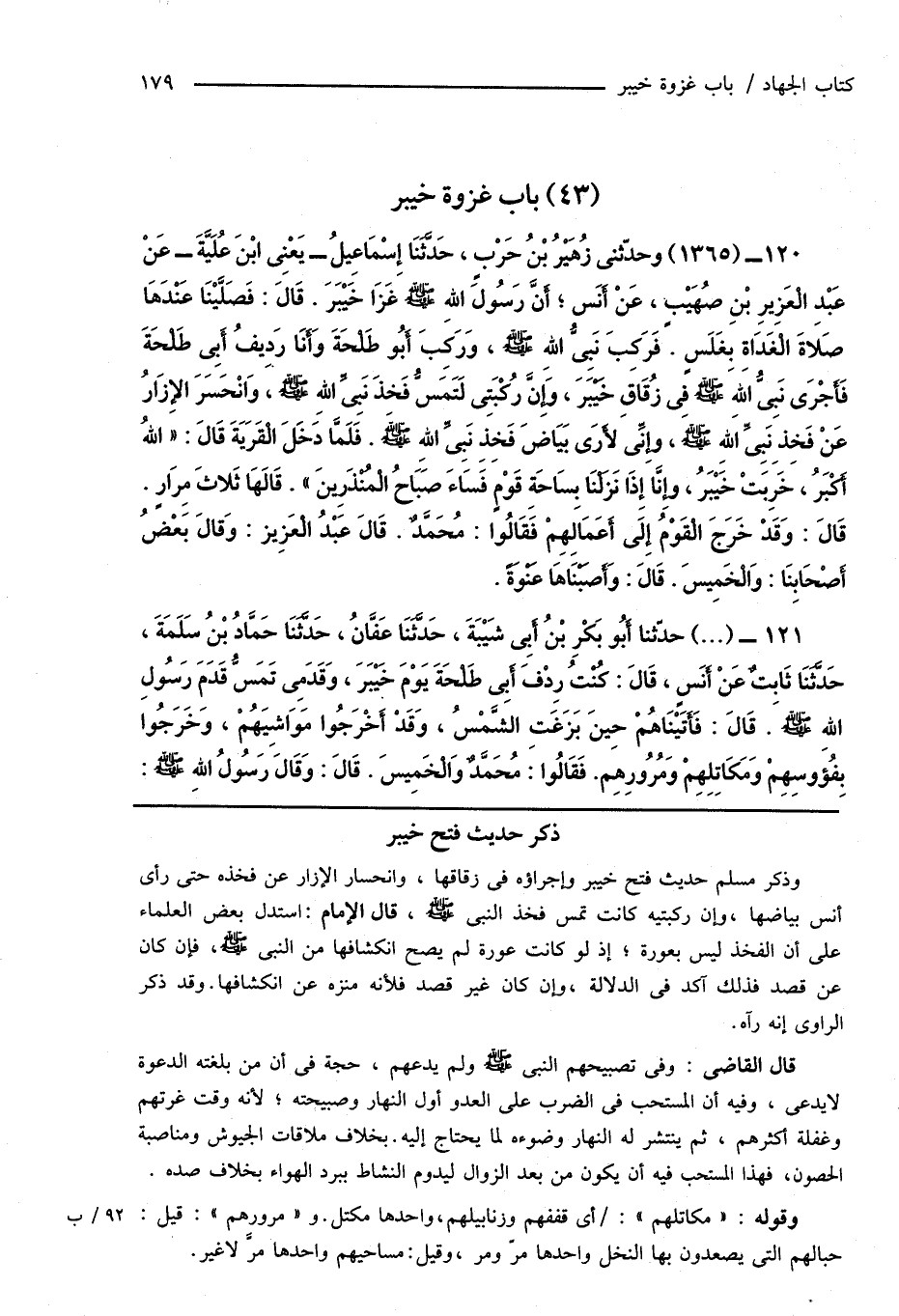 وذكر مسلم حديث فتح خيبر وإجراؤه فى زقاقها، وانحسار الإزار عن فخذه حتى رأى أنس بياضها، وإن ركبتيه كانت تمس فخذ النبى صَلَّى اللهُ عَلَيْهِ وَسَلَّمَ، قال الإمام: استدل بعض العلماء على أن الفخذ ليس بعورة؛ إذ لو كانت عورة لم يصح انكشافها من النبى صَلَّى اللهُ عَلَيْهِ وَسَلَّمَ، فإن كان عن قصد فذلك آكد فى الدلالة، وإن كان غير قصد فلأنه منزه عن انكشافها. وقد ذكر الراوى إنه رآه.